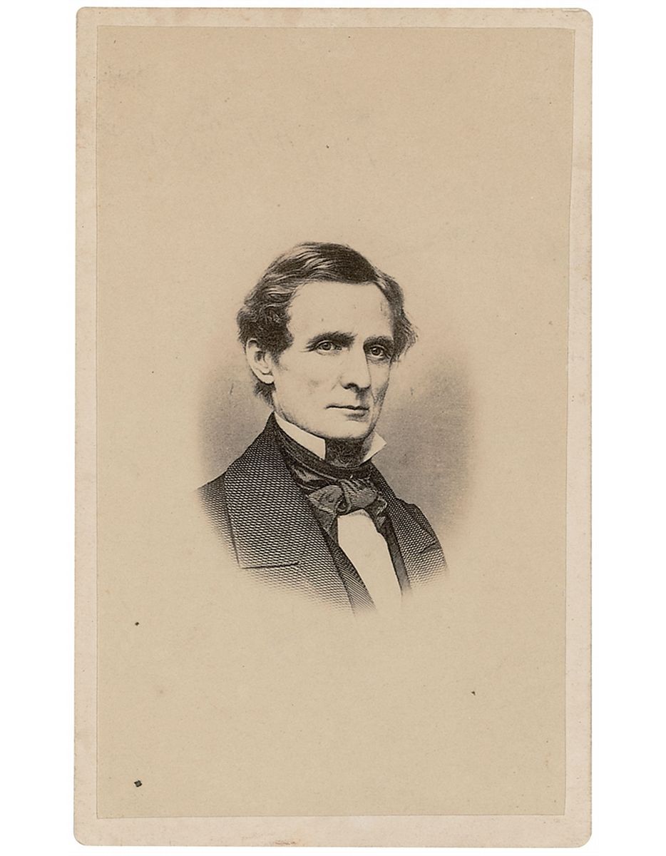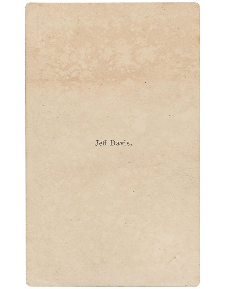 Original 2.25 x 4 anonymous carte-de-visite bust portrait of Jefferson Davis that reproduces an engraved portrait. Light edge and corner wear only.