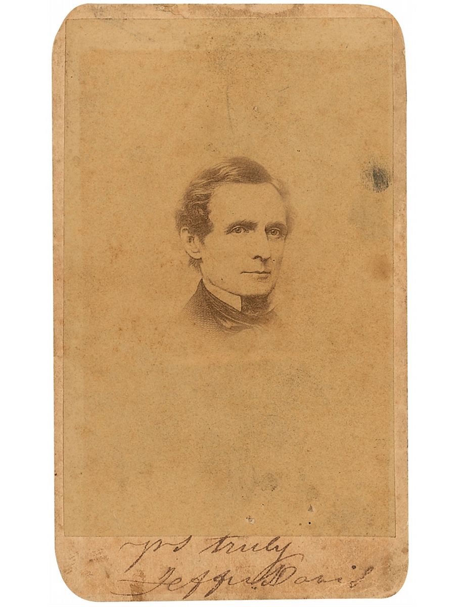 American military officer and politician (1808–1889) who, after serving as a senator and US secretary of war, was the first and only president of the Confederacy, from 1861 until its collapse at the end of the Civil War. Original 2.25 x 4 carte-de-visite bust portrait of Davis in his prime, signed in the lower border in black ink, “Yrs truly, Jeffer. Davis.” In very good condition, with moderate overall soiling (affecting image and signature), a small dark stain to the right border, rounded corners, and mounting remnants to reverse. Davis is extremely rare in signed photos and this is a much younger pose than typically seen.