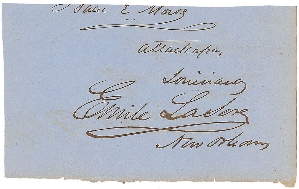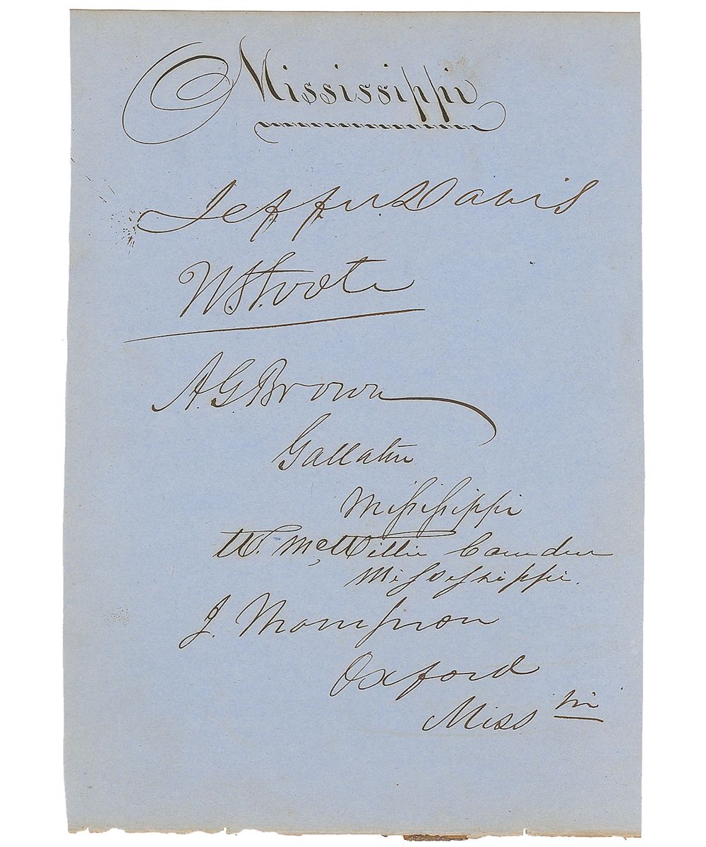 Ink signature, “Jeffer. Davis,” on a light blue 5.5 x 8 album page. Also signed by fellow Mississippi congressmen Henry Foote, Albert G. Brown, William McWillie, and Jacob Thompson. An additional slip is signed by Winfield S. Featherston. In fine condition.