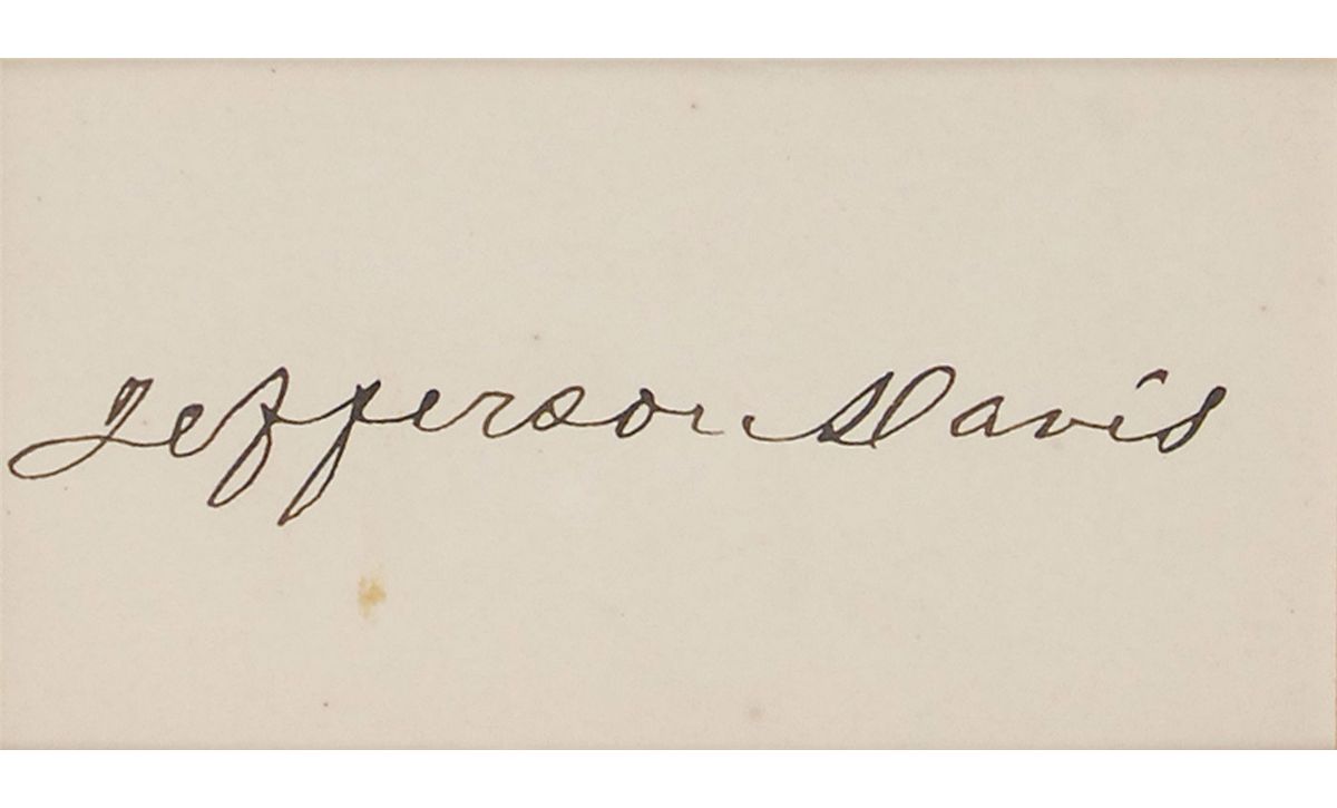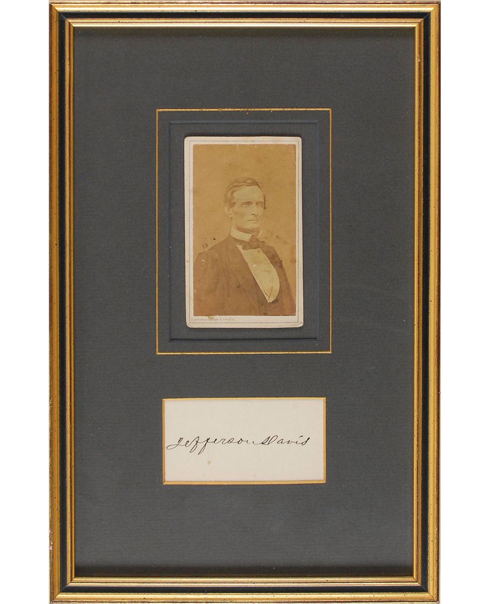 Nice ink signature, “Jefferson Davis,” on an off-white slip. Matted and framed with a carte-de-visite of Davis by C. D. Fredricks and Company to an overall size of 8 x 12.5. In fine condition.