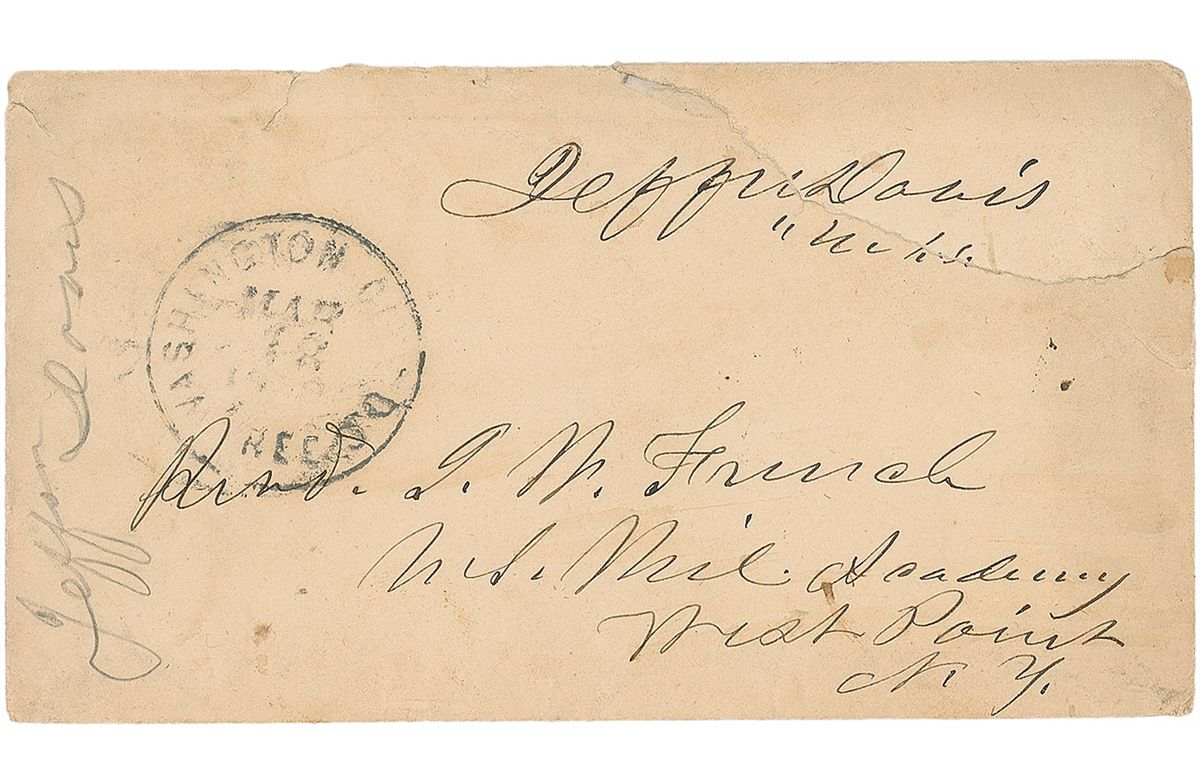 Hand-addressed and free franked mailing envelope, 5.5 x 3, addressed by Davis to “Revd. J. W. French, US Mil. Academy, West Point, N. Y.,” and franked in the upper right, “Jeffer. Davis, USS.” Postmarked Washington, DC, Free, March 18, 1859. In very good condition, with a repaired tear to the upper right passing through the signature and light toning and soiling. At this time, Davis was one of Mississippi’s senators, and French was chaplain and a professor of geography, history, and ethics at the Military Academy at West Point. He was appointed to this position at West Point by President Franklin Pierce, and was informed by Jefferson Davis, who was secretary of war. French’s friendship with Davis led some to question his loyalty at the outbreak of the Civil War, but he remained West Point’s chaplain until his death in 1871.