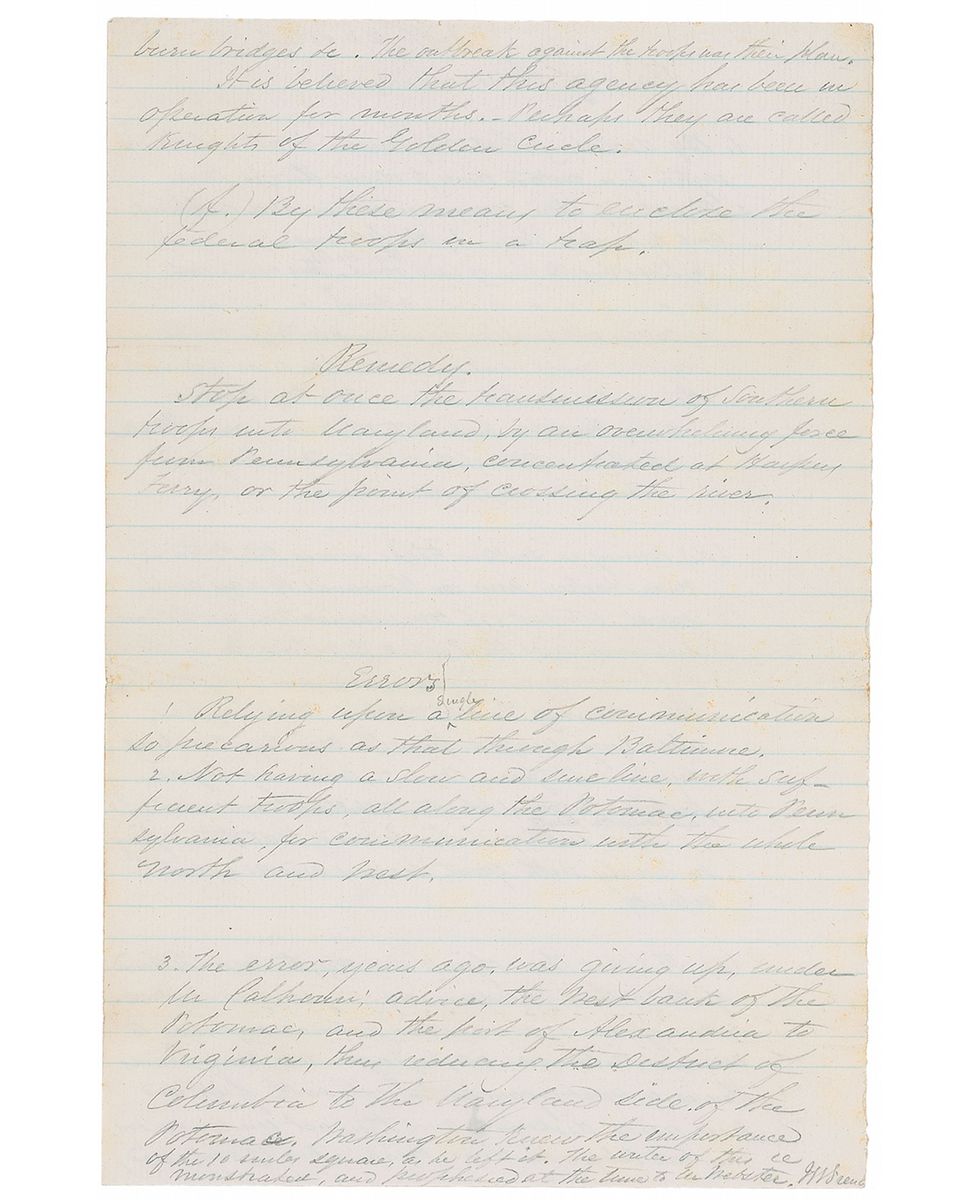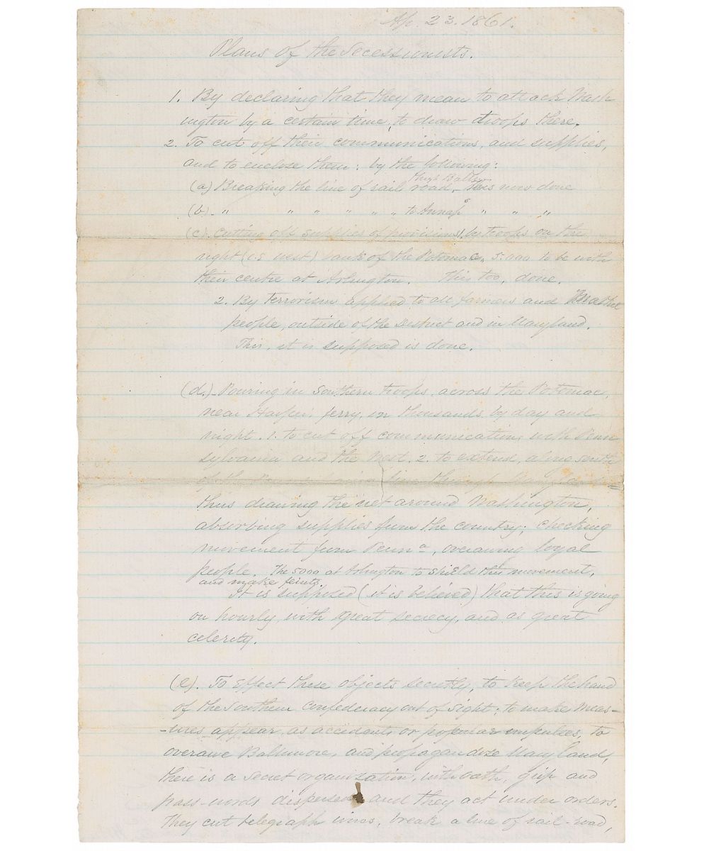 Also includes an AMS in pencil by French, one page both sides, 8 x 12, April 23, 1861, entitled “Plans of the Secessionists.” It covers in thorough detail areas important to the North that were susceptible to disruption, including communications and supply lines, as well as potential military strategies. He concludes: “Remedy. Stop at once the transmission of Southern troops with Maryland, by an overwhelming force from Pennsylvania, concentrated at Harpers Ferry, or the point of crossing the river.” In fine condition, with writing light but legible.