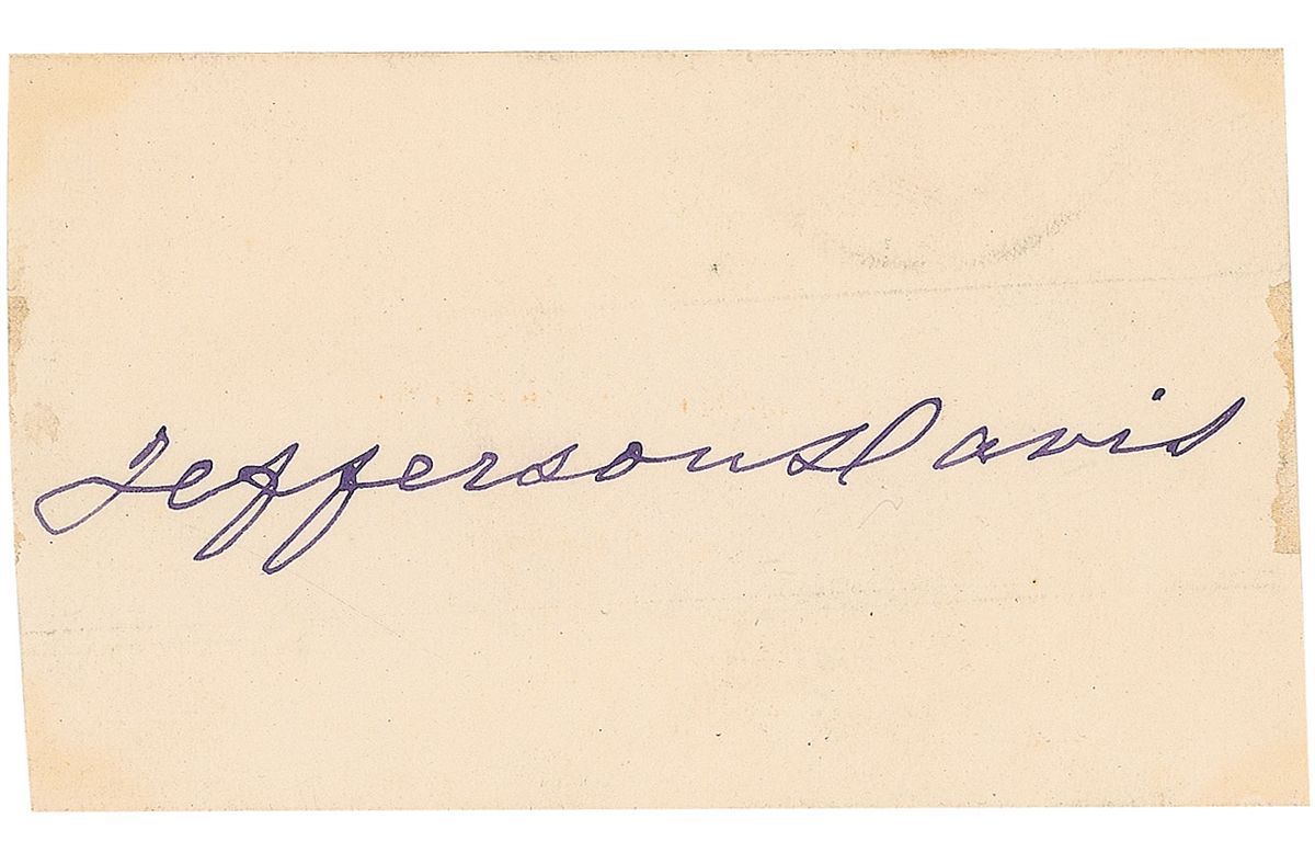 Ink signature, “Jefferson Davis,” on an off-white 3.25 x 2 card. A few surface marks and hints of adhesive remnants to closely cropped edges, otherwise fine condition.