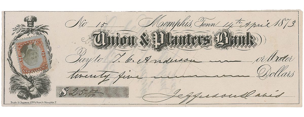 Bank check, 8.25 x 2.75, filled out in another hand and signed by Davis, payable to T. C. Anderson for $25, April 14, 1873. A two-cent revenue stamp is affixed to the left side. In fine condition, with a vertical fold passing through a single letter of the signature, expected cancellation cuts to the body, and tack holes to the left side. An attractive boldly signed example of Davis’s full signature in a rarely seen format. Just months after issuing this payment, Davis would resign his position as president of the Carolina Life Insurance Company and depart for England.
