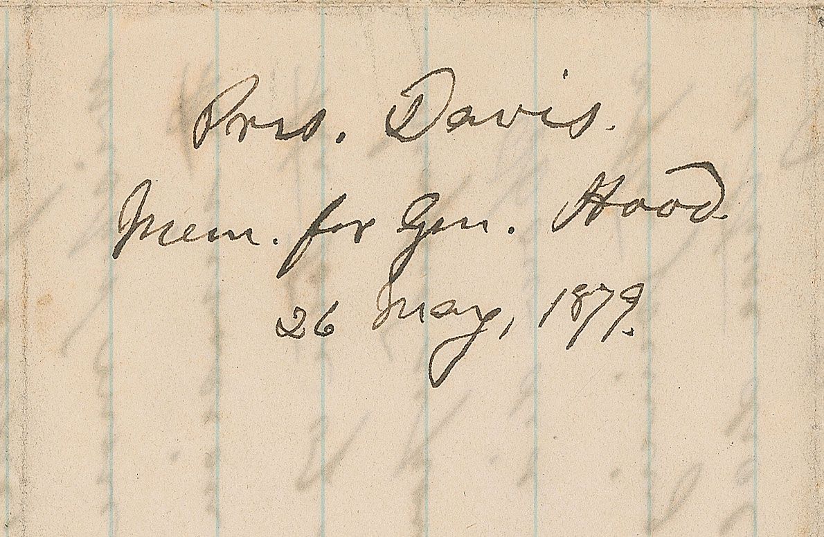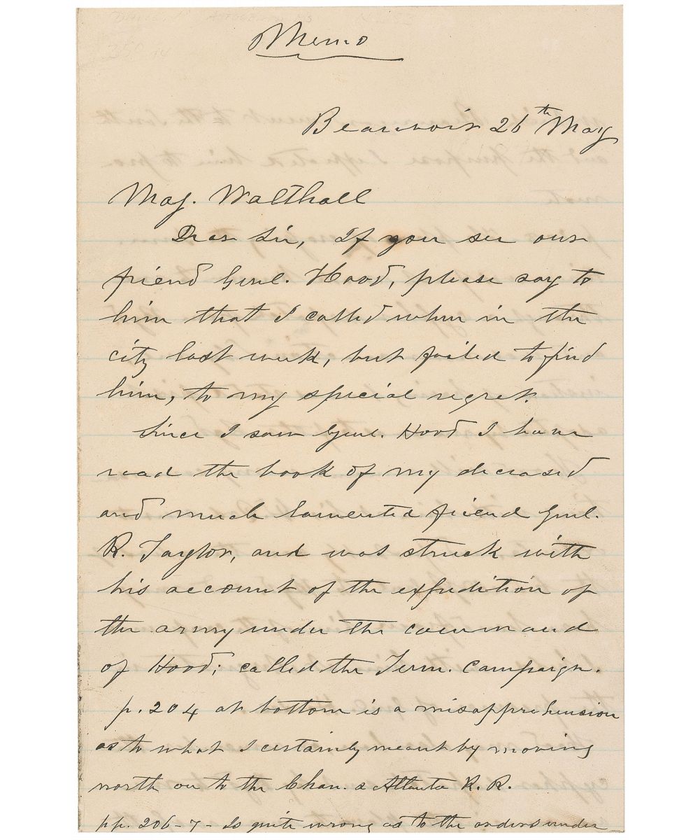 Handwritten letter, unsigned, three pages on two adjoining sheets, 5.25 x 8, May 26, 1879. Headed “Memo,” at the top by Davis, to Major William T. Walthall. In full: “If you see our friend Genl. [John Bell] Hood, please say to him that I called when in the city last week, but failed to find him, to my special regret. Since I saw Genl Hood I have read the book of my deceased and much lamented friend Genl. R. Taylor, and was struck with his account of the expedition of the army under the command of Hood; called the Tenn. Campaign p.204 at bottom is a misapprehension as to what I certainly meant by moving north on to the Chan. & Atlanta R.R. pp. 206-7—Is quite wrong as to the orders under which Beauregard went to the South and the purpose I expected him to promote. P 208—The plan of crossing the Tenn. River was first made known to me through a cypher dispatch from Bgd. [Beauregard] and was never sanctioned by me, instead of having him as stated first adopted by me so as to filter Bgd.