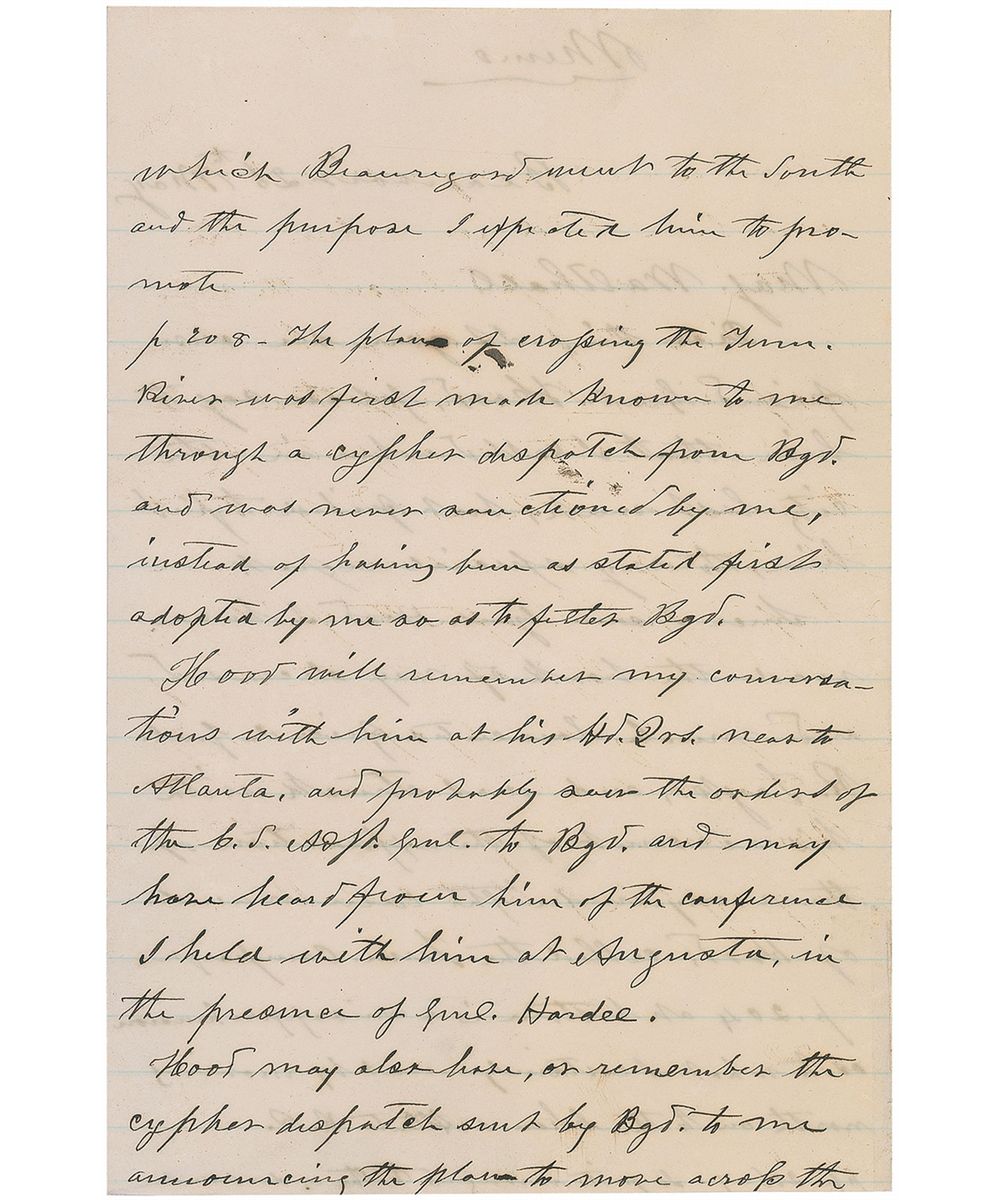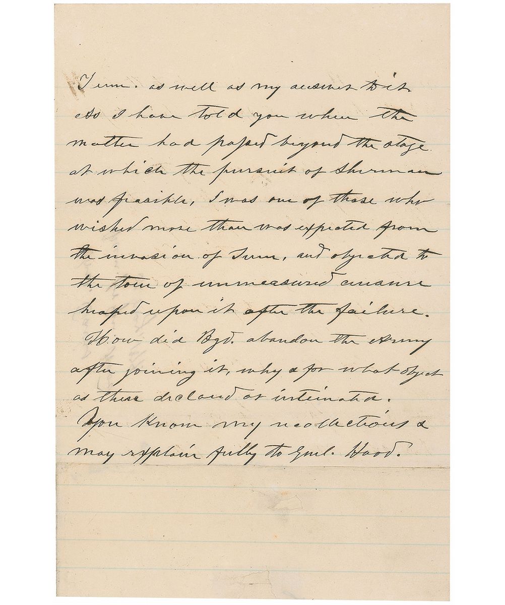 Hood will remember my conversations with him at his Hd.Qrs. next to Atlanta, and probably saw the orders of the C.S. Adj. Genl. to Bgd. and may have heard from him of the conference I held with him at Augusta, in the presence of Genl. Hardee. Hood may also have, or remember the cypher dispatch sent by Bgd. to me announcing the plan to move across the Tenn. as well as my answer to it. As I have told you when the matter had passed beyond the stage at which the pursuit of Sherman was feasible, I was one of those who wished more than was expected from the invasion of Tenn. and objected to the tour of unmeasured censure heaped upon it after the failure. How did Bgd. abandon the Army after joining it, why & for what object as these declared as intimated. You know my recollections & may explain fully to Genl. Hood.” In fine condition, with lower blank portion of last page replaced (most likely due to removal of signature).