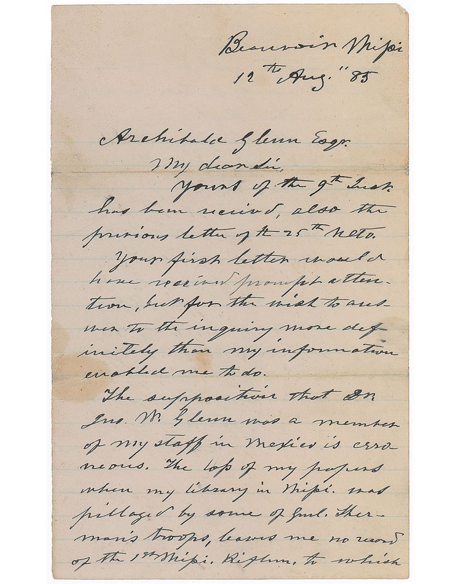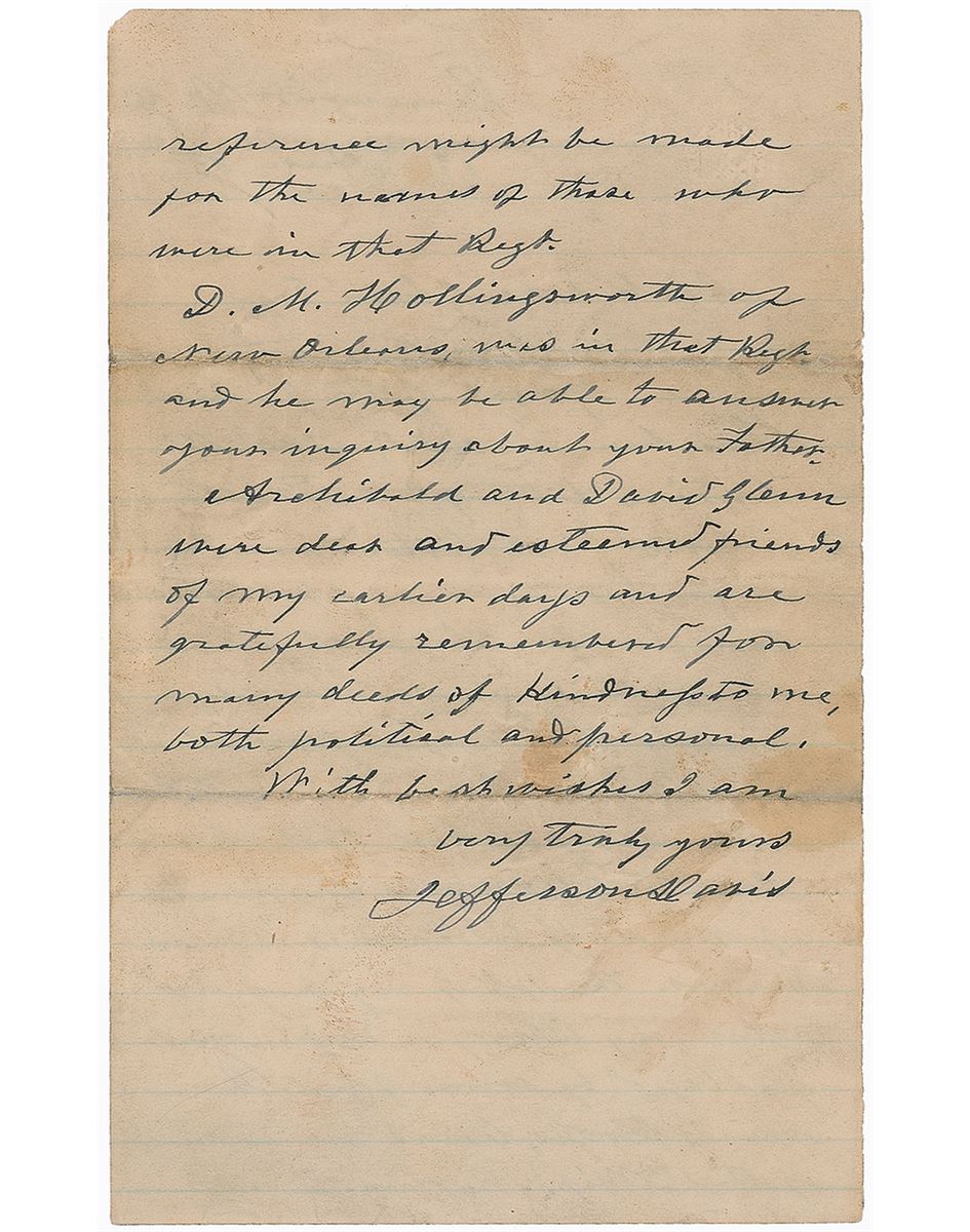 ALS, one lightly lined page both sides, 5 x 8, August 12, 1885. Davis writes from Beauvoir, Mississippi, to Archibald Glenn. In part: “The supposition that Dr. Jno. Glenn was a member of my staff in Mexico is erroneous. The loss of my papers when my library in Misi. was pillaged by some of Gen’l Sherman’s troops, leaves me no record of the 1st Misi. Riflemen to which reference might be made…. D. M. Hollingsworth of New Orleans was in that Regt. and he may be able to answer your inquiry about your father. Archibald and David Glenn were dear and esteemed friends of my earlier days and are gratefully remembered for many deeds of kindness to me, both political and personal.” In very good condition, with professional archival reinforcement to horizontal mailing folds, light wrinkling and handling wear, and scattered soiling and staining (lightly touching signature). During the Battle of Vicksburg, Davis’s plantation home of Brierfield was pillaged by Union troops, who ransacked his furniture, letters, and books, leaving Davis—as referenced here—with many missing records.