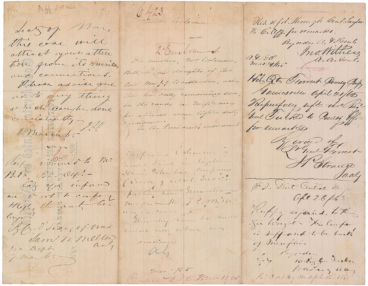 Desirable Civil War–dated autograph endorsement, signed “J. D.,” penned on the reverse of a letter sent to him by Lieutenant T. P. A. Bibb, one page, 7.75 x 10, CSA Post Office Department letterhead, March 6, 1865. Forwarding the letter, Davis writes, in full: “Secy of War, this case will attract your attention from its merits and connections. Please advise me as to any thing which can be done consistently.” The initial request concerns an assignment for light service for Private Chapman Coleman, the grandson of deceased powerful senator and Attorney General John. J. Crittenden. In very good condition, with scattered staining affecting portions of Davis’s endorsement, and much of the other writing significantly faded.
