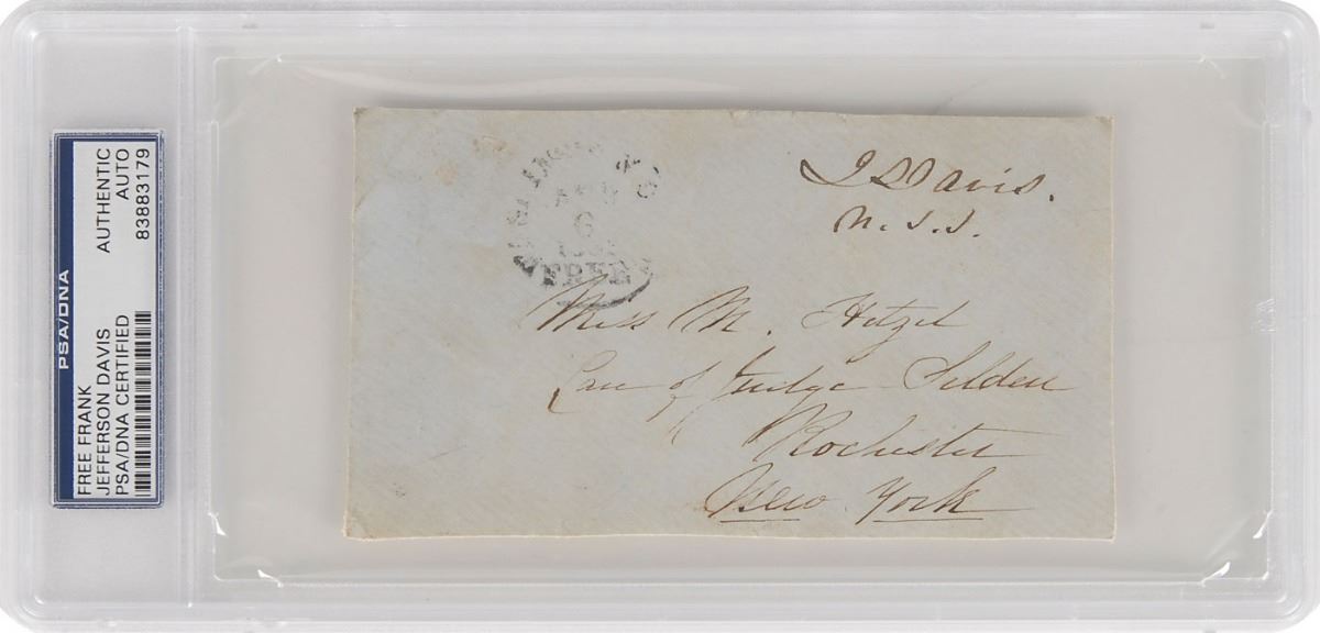 Free franked envelope panel, 5.5 x 3, addressed in another hand to “Miss M. Hetzel, Care of Judge Selden, Rochester, New York,” and franked in the upper right, “J. Davis, U. S. S.” Encapsulated in a plastic PSA/DNA authentication holder. In fine condition.