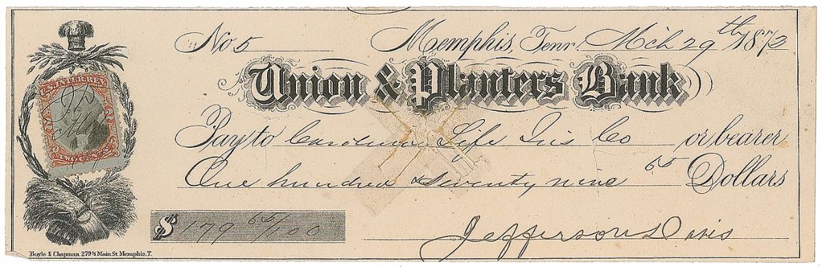 Bank check, 8.5 x 2.75, filled out in another hand and signed in full by Davis, "Jefferson Davis," payable to a life insurance company for $179.65, March 29, 1872. In very good to fine condition, with show-through from old tape reinforcement of the central cancellation cuts.