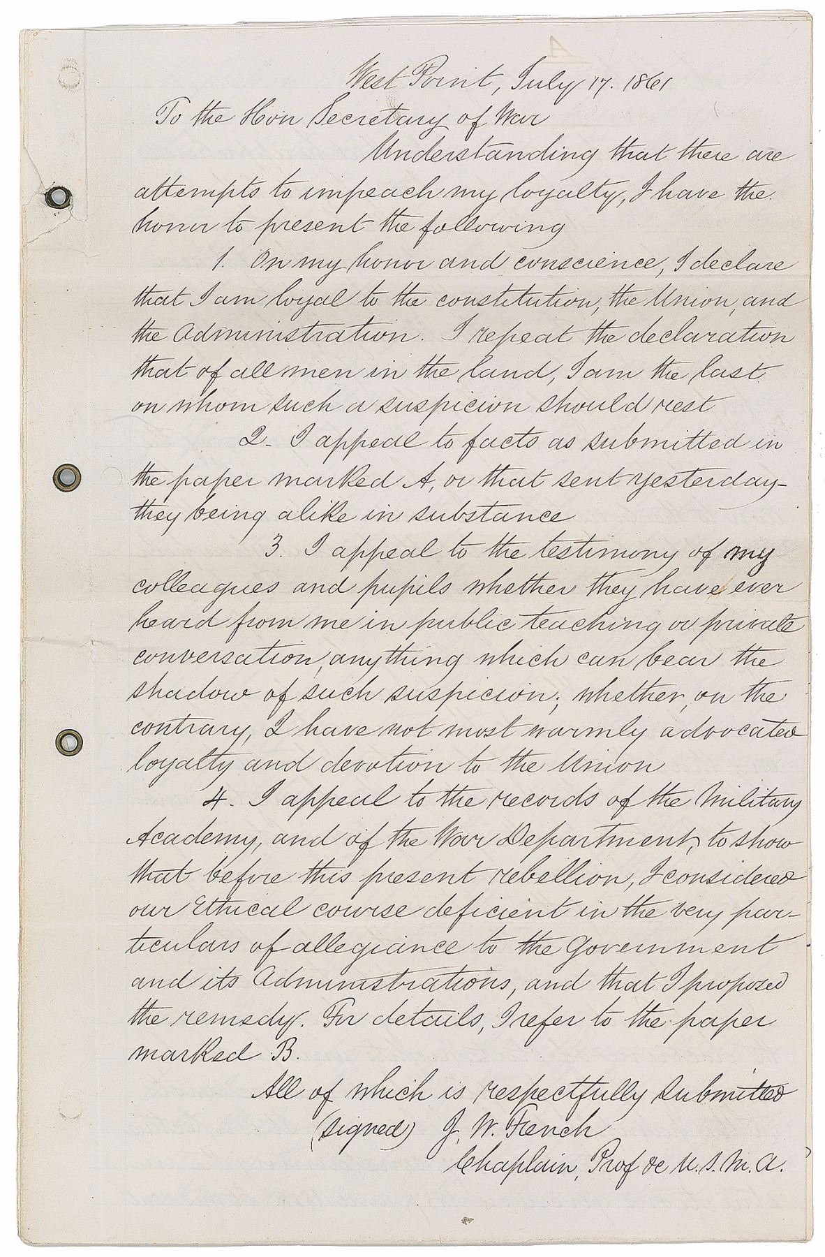 Also included is a bound handwritten copy of a manuscript document of French’s, 13 pages on seven sheets, 8.25 x 13, attesting to his devotion to the Union. In part: “On my honor and conscience, I declare that I am loyal to the constitution, the Union, and the administration. I repeat the declaration that of all men in the land, I am the last on whom such a suspicion should rest…I appeal to the testimony of my colleagues and pupils whether they have ever heard from me in public teaching or private conversation, anything which can bear the shadow of such suspicion; whether, on the contrary, I have not most warmly advocated loyalty and devotion to the Union…I felt the troubles of the country as I would a personal affliction from my strong nationality of sentiment. I was made sick by it in December and January. Supposing Mr. Jefferson Davis national and knowing that he had influence with Mr. Buchanan, I wrote to him earnestly advising the employment of force, and pointing out measures, some of them since adopted…I turned to General Scott, and sought to effect an entire reliance of the President upon him. I advised bringing President Lincoln incognito to Washington, more than a month before the inauguration, and the forming of a perfect chain of offensive and defensive measures, between Mr. Buchanan, Mr. Lincoln and Genl. Scott, known only to themselves. Genl. Scott still has these letters of mine on this subject. I refer to him. These were not the acts of one wanting in devotion to the Union.”