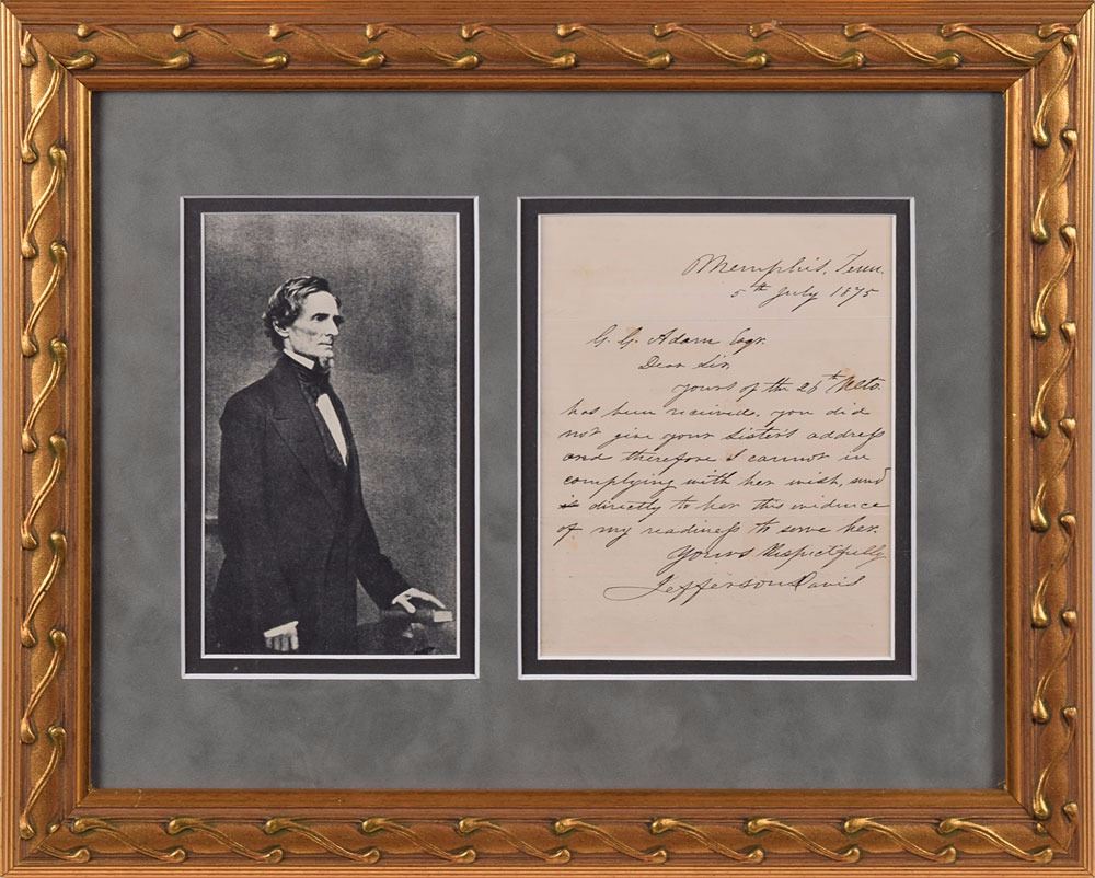 ALS, one page, 5 x 6, July 5, 1875. Letter to G. G. Adam, in part: "You did not give your Sister’s address and therefore I cannot in complying with her wish, send directly to her this evidence of my readiness to serve her." Double-matted and framed with a portrait to an overall size of 15 x 12. In fine condition.