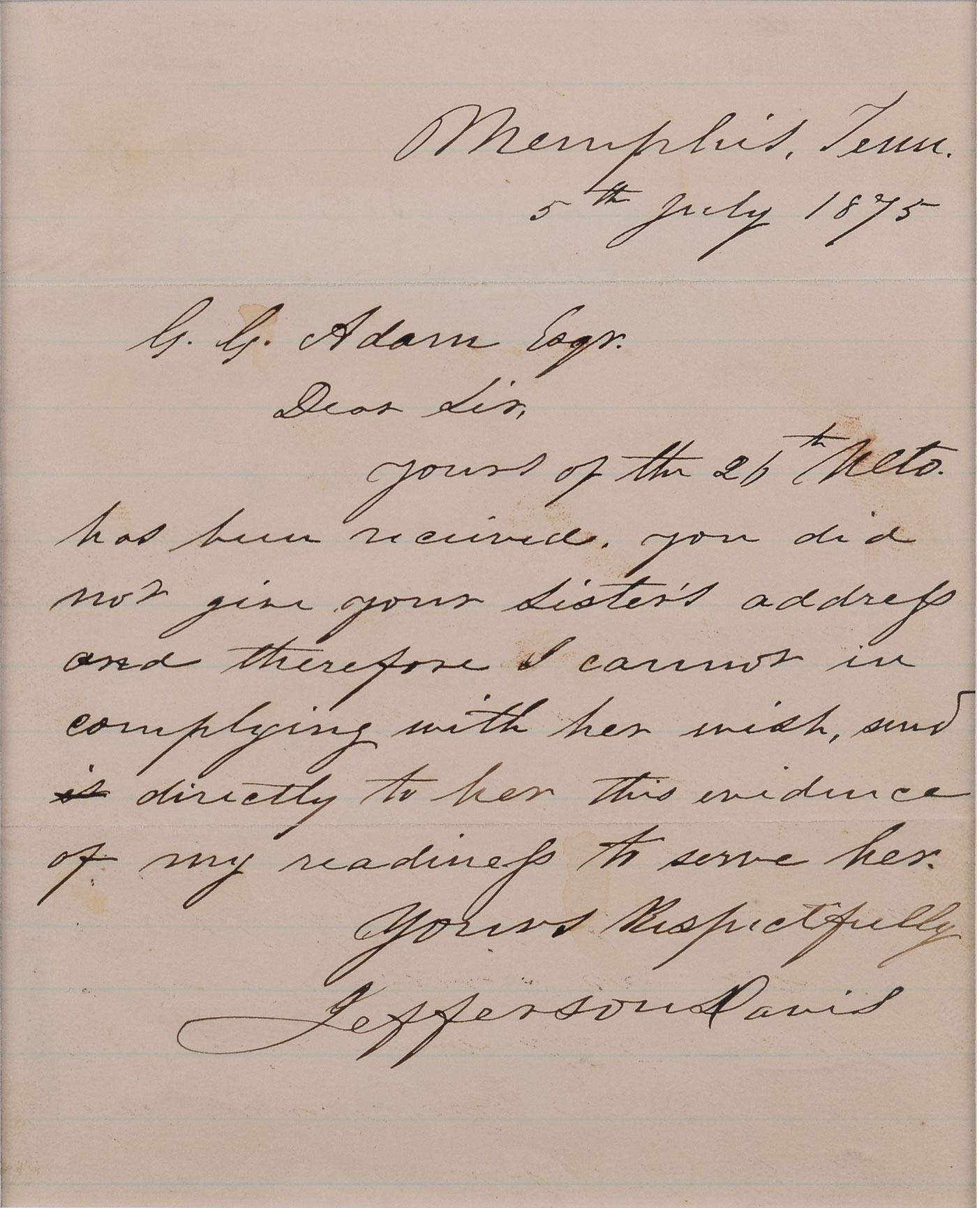 ALS, one page, 5 x 6, July 5, 1875. Letter to G. G. Adam, in part: "You did not give your Sister’s address and therefore I cannot in complying with her wish, send directly to her this evidence of my readiness to serve her." Double-matted and framed with a portrait to an overall size of 15 x 12. In fine condition.