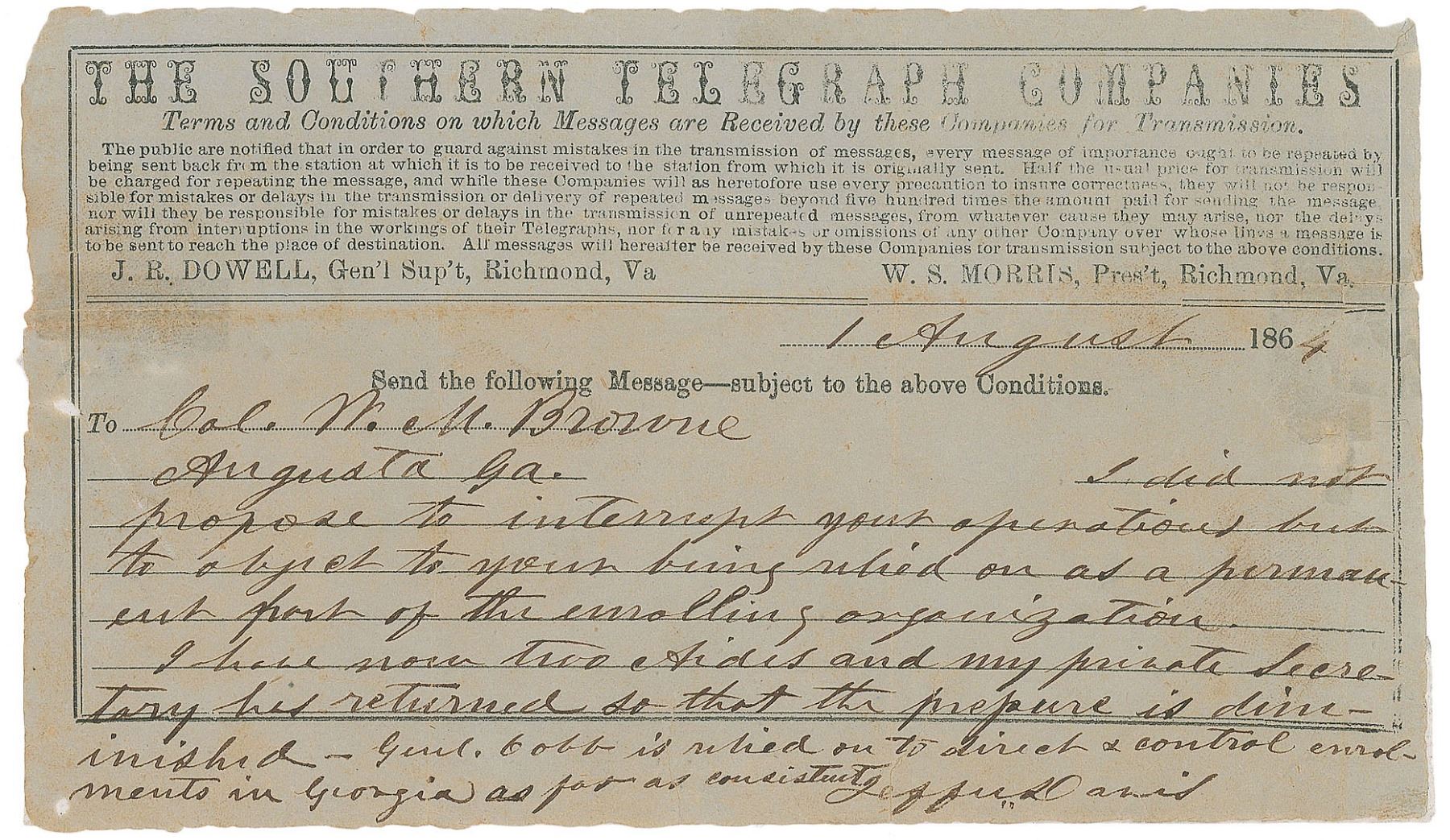 Civil War-dated ALS as president of the Confederate States, signed “Jeffer. Davis,” one page on a 7.25 x 4.25 sheet from The Southern Telegraph Company, August 1, 1864. Message addressed to Colonel William M. Browne, the commander of Georgia conscripts in charge of raising troops, in full: "I did not propose to interrupt your operations but to object to your being relied on as a permanent part of the enrolling organization. I have now two Aides and my private Secretary has returned so that the pressure is diminished. Genl. Cobb is relied on to direct & control enrolments in Georgia as far as consistent." In fine condition, with light stains from old tape repairs on the reverse.