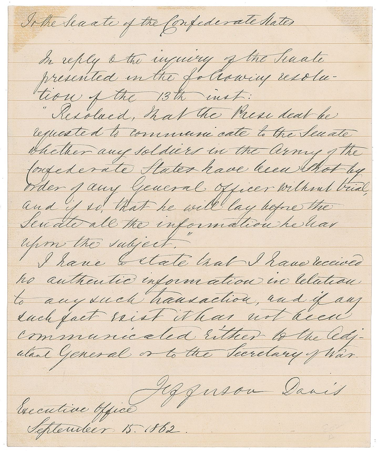 Civil War–dated LS, one page, 7.75 x 9.25, September 15, 1862. Letter to "the Senate of the Confederate States," in full: "In reply to the inquiry of the Senate presented in the following resolution of the 13th inst: 'Resolved, that the President be requested to communicate to the Senate whether any soldiers in the Army of the Confederate States have been shot by order of any General officer without trial, and if so, that he will lay before the Senate all the information he has upon the subject.' I have to state that I have received no authentic information in relation to any such transaction, and if any such fact exist it has not been communicated either to the Adjutant General or the the Secretary of War." In fine condition, with light show-through at the upper corners from old adhesive residue on the reverse.