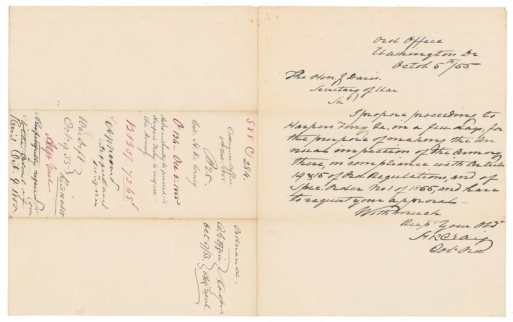 Desirable autograph endorsement, "Approved, Jeffer. Davis, Sec'y of War," on the reverse of a letter sent to him by Chief of Ordnance Henry K. Craig, 7.75 x 9.75, October 5, 1855. The letter, signed "H. K. Craig," in full: "I propose proceeding to Harpers Ferry Va, in a few days, for the purpose of making the annual inspection of the Armory there, in compliance with Articles 14 & 15 of Ord. Regulations, and of Spec. Order No. 1 of 1855, and have to request your approval." In fine condition. John Brown's raid on the armory at Harpers Ferry would begin almost exactly four years later, on October 16, 1859. An interesting piece concerning a significant landmark of the era.