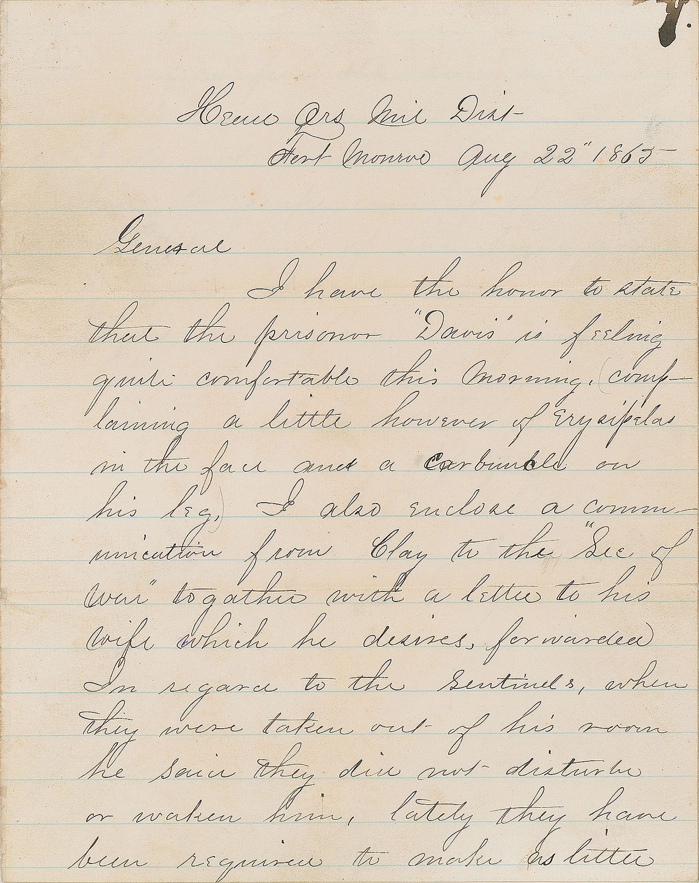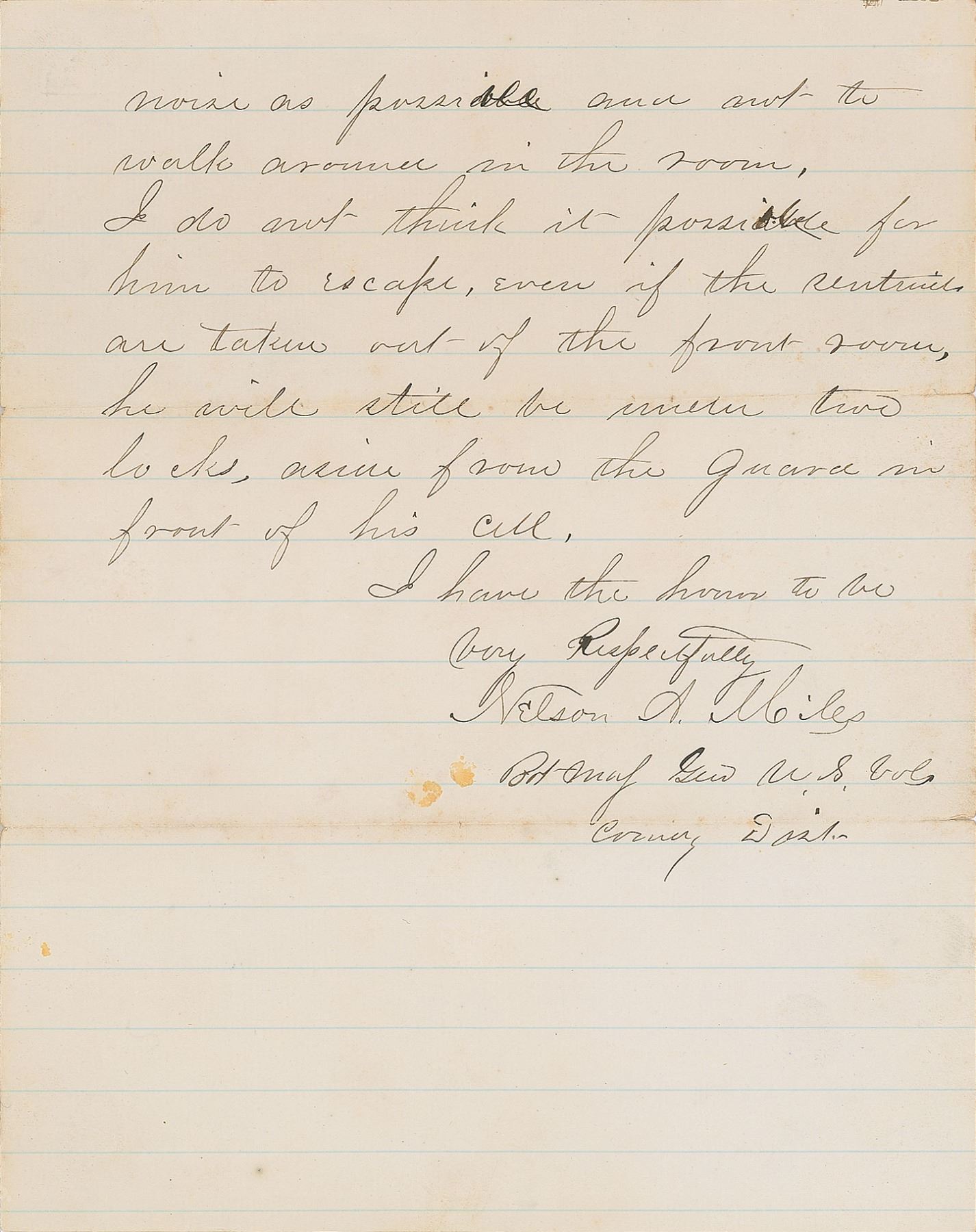 ALS signed “Nelson A. Miles,” two pages on two adjoining sheets, 7.75 x 9.75, August 22, 1865. Letter to an unnamed general, in full, “I have the honor to state that the prisoner ‘Davis’ is feeling quite comfortable this morning, complaining a little however of erysipelas in the face and a carbuncle on his leg. I also enclose a communication from [Clement] Clay to the ‘Sec of War’ together with a letter to his wife which he desires, forwarded. In regard to the Sentinels, when they were taken out of his room he said they did not disturbe or waken him, lately they have been required to make as little noise as possible and not to walk around in the room. I do not think it possible for him to escape, even if the sentinels are taken out of the front room, he will still be under two locks, aside from the Guard in front of his cell.” Although the recipient is unnamed, Miles sent all his reports about the prisoners and mail to Assistant Adjutant General Edward D. Townsend. In fine condition, with light soiling and a few small stains.