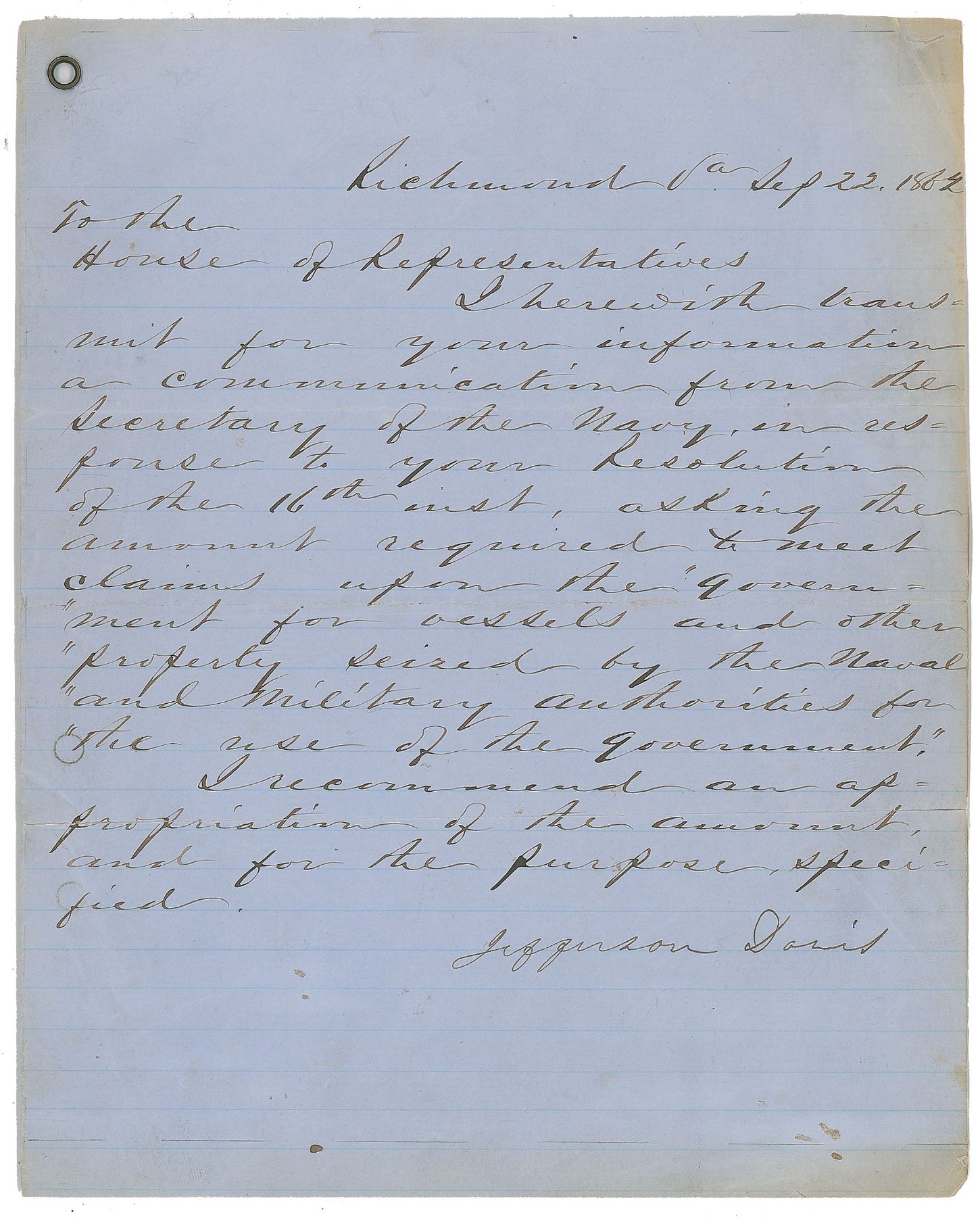 Civil War-dated LS as president of the Confederate States of America, one page, lightly lined, 7.75 x 9.75, September 22, 1862. Written from Richmond, Virginia, a letter to the House of Representatives, in full: "I herewith transmit for your information a communication from the Secretary of the Navy, in response to your Resolution of the 16th inst, asking the amount required to meet claims upon the 'government for vessels and other property seized by the Naval and military authorities for the use of the government.' I recommend an appropriation of the amount, and for the purpose specified." In very good to fine condition, with light creasing, a small tear to upper right corner, and a small grommet to the upper left. On September 16, 1862, a day before the Battle of Antietam, the Congress of the Confederate States passed a resolution tendering thanks to Commander Ebenezer Farrand and Captain Augustus Drewry for their victory at Drewry's Bluff five months earlier, with the motion likewise entitling reparations to ‘all who contributed thereto.’ With Jefferson’s estimates taken into account, Congress passed an act ‘making appropriations for the Executive, Legislative and Judicial Expenses of the Government,’ with claims for seized vessels totaling to $10,237.50.