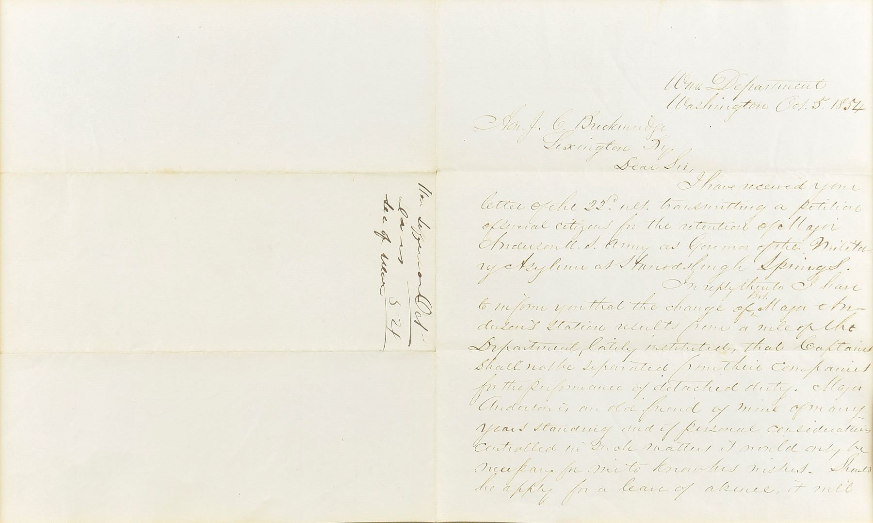 ALS signed “Jeffer. Davis,” one page both sides, 8 x 9.5, October 5, 1854. As Secretary of War, Davis writes to to Kentucky Senator John C. Breckinridge. In full: "I have received your letter of the 22'd ult. transmitting a petition of several citizens for the retention of Major Anderson U. S. Army as Governor of the Military Asylum at Hanodsburgh Springs. In reply thereto I have to inform you that the change of Major Anderson's station results from a rule of the Department, lately instituted, that Captains shall not be separated from their companies for the performance of detached duty. Major Anderson is an old friend of mine many years standing and if personal considerations controlled in such matters it would only be necessary for me to know his wishes. Should he apply for a leave of absence, it will be considered as favorably as the exigencies of the service will permit." Matted and framed to an overall size of 21 x 14.75; window to frame backing reveals second page of letter. In fine condition, with scattered light creasing.