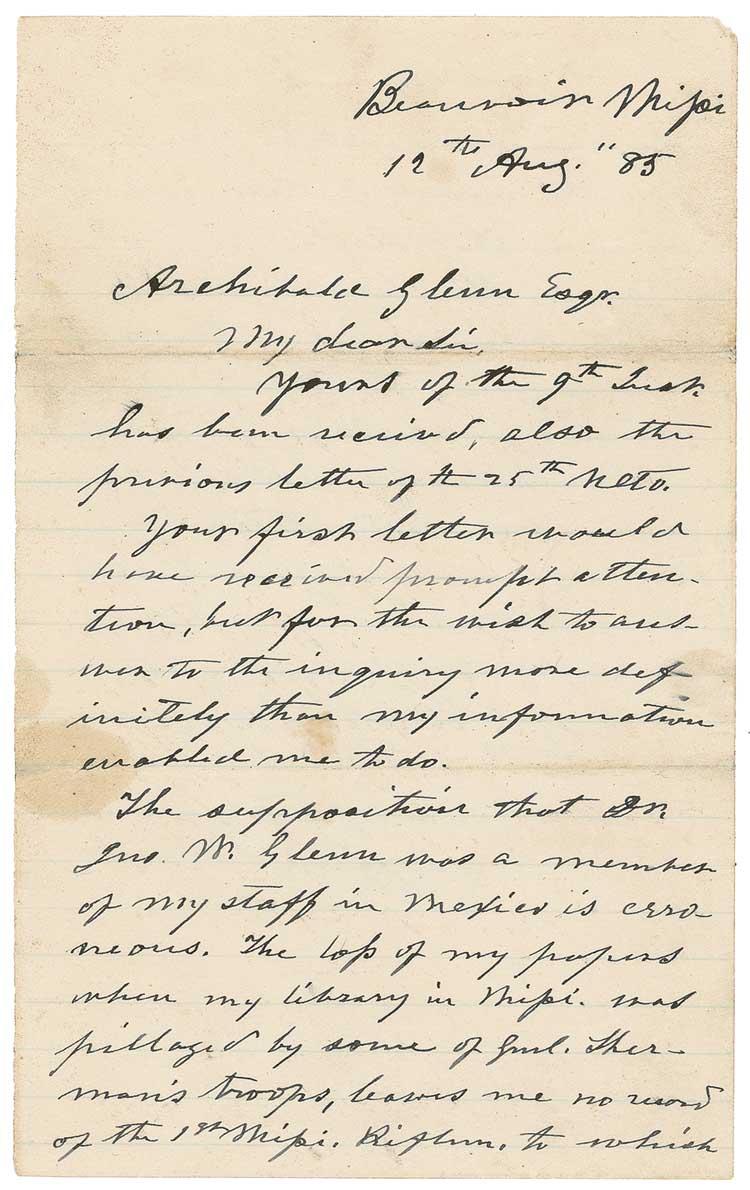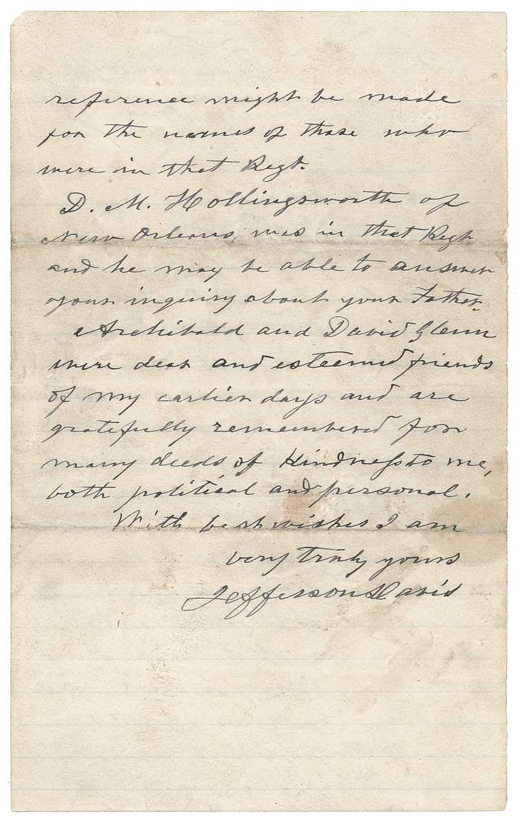 ALS, one lightly lined page both sides, 5 x 8, August 12, 1885. Davis writes from Beauvoir, Mississippi, to Archibald Glenn. In part: “The supposition that Dr. Jno. Glenn was a member of my staff in Mexico is erroneous. The loss of my papers when my library in Misi. was pillaged by some of Gen’l Sherman’s troops, leaves me no record of the 1st Misi. Riflemen to which reference might be made…. D. M. Hollingsworth of New Orleans was in that Regt. and he may be able to answer your inquiry about your father. Archibald and David Glenn were dear and esteemed friends of my earlier days and are gratefully remembered for many deeds of kindness to me, both political and personal.” In very good condition, with professional archival reinforcement to horizontal mailing folds, light wrinkling and handling wear, and scattered soiling and staining (lightly touching signature).