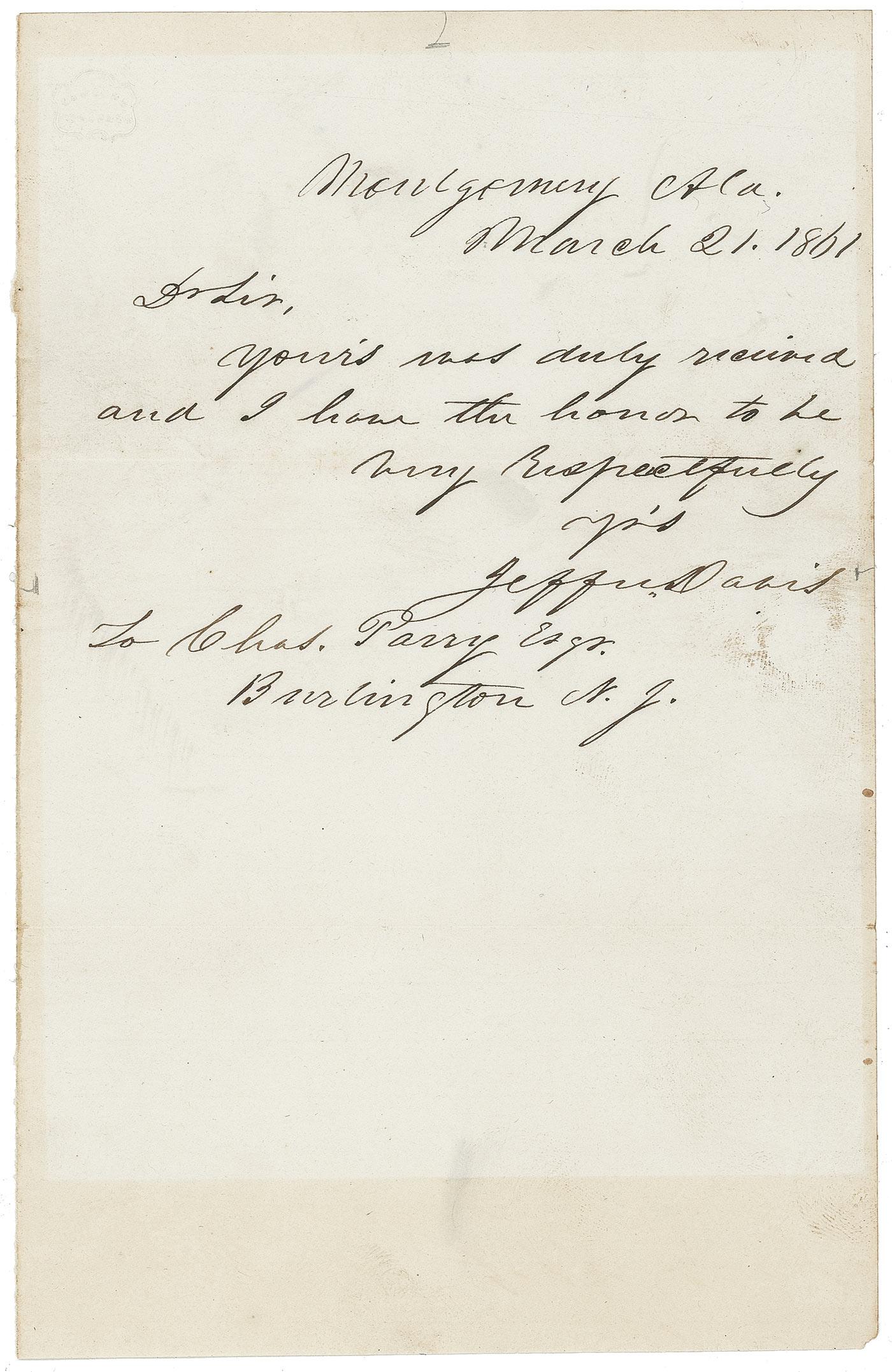 Rare and early ALS signed as president of the Confederacy, “Jeffer Davis,” one page, 5 x 7.75, March 21, 1861. Letter to Charles Parry in Burlington, New Jersey. In full: “Yours was duly received and I have the honor to be very respectfully yrs.” In very good to fine condition, with light edge toning from previous display, scattered light creasing and wrinkling, and a bit of light soiling slightly affecting end of signature.
