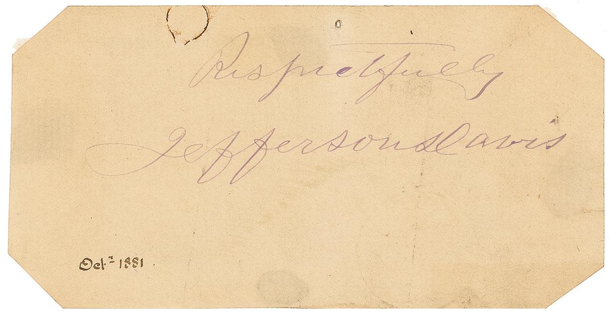 Ink signature, “Respectfully, Jefferson Davis,” on an off-white 5 x 2.75 slip, with a collector’s notation of “Oct. 1881,” to lower left. In very good condition, with clipped corners, some light toning and soiling, tack hole and small circular rust spot to top edge, and light show-through from mounting remnants on reverse. Pre-certified PSA/DNA and RRAuction COA.