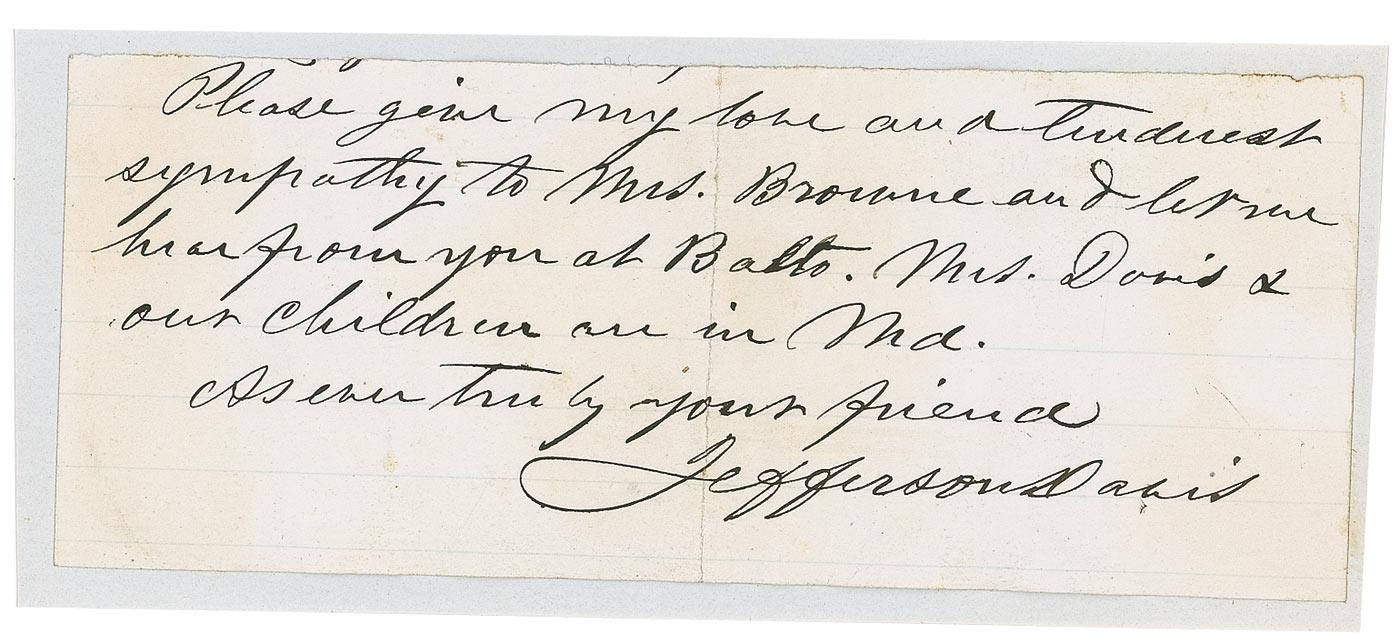 Self-contained partial ALS clipped from the conclusion of a longer letter, lightly-lined, 5.75 x 2.5. In full: “Please give my love and tenderest sympathy to Mrs. Browne and let me hear from you at Balto. Mrs. Davis & our children are in Md. As ever truly your friend.” Affixed to slightly larger sheet. In fine condition with two vertical folds, light rippling, and faint show-through from glue on the reverse.