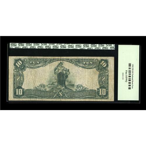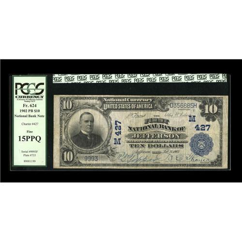 <B>Jefferson, OH</B></I> - $10 1902 Plain Back Fr. 624 <B>The First NB </B></I> Ch. # (M)427<BR>This rare bank issued large size only and has a census of but five examples documented as extant. This particular note is an old friend, having passed through our Florida United Numismatists auction in 2002, where it sold for $431.25. Certified as <B>PCGS Fine 15PPQ</B></I> and in today's much stronger market for better Nationals, it will certainly surpass its previous realization.