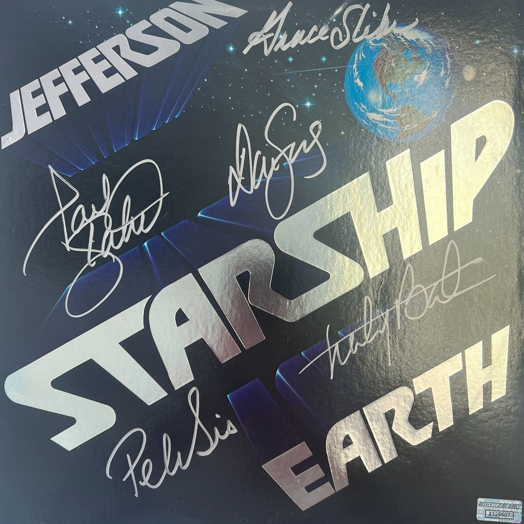 Jefferson Starship Earth signed album autographed by Grace Slick, Paul Kantner, Marty Balin and Pete Sears. 12x12 inches. Vinyl included. GFA Authenticated