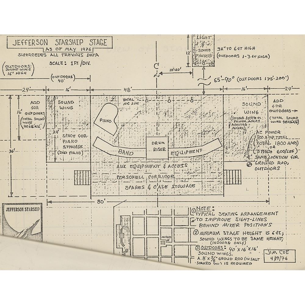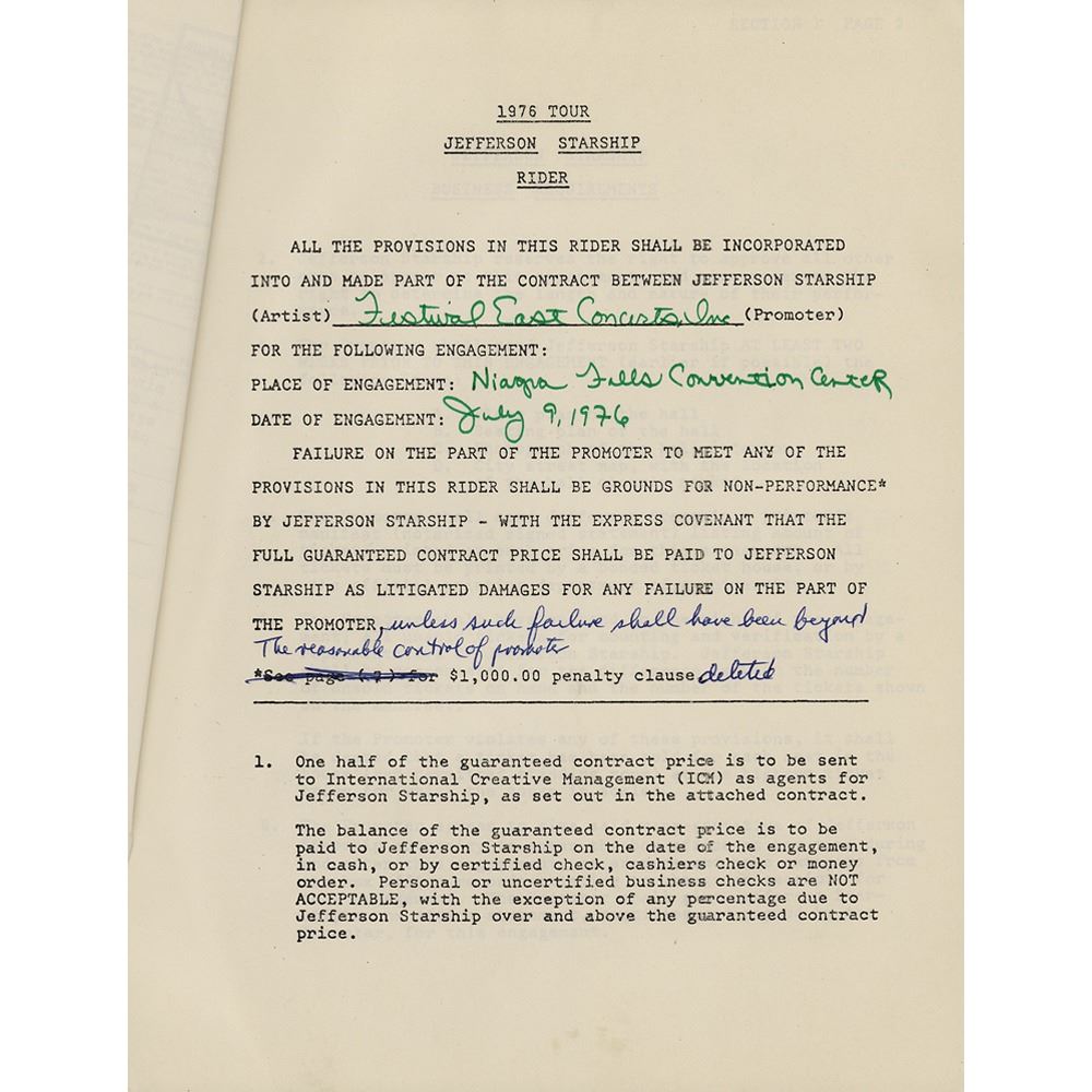 DS, one page, 8.5 x 11, June 9, 1976. An International Creative Management contract between Paul Kantner and Festival East Concerts, Inc., with the former confirming that Jefferson Starship will perform at the Niagara Falls International Convention Center on July 9, 1976. Signed at the conclusion in black ballpoint by Kantner. Receipts related to a "50% talent deposit" are stapled to the front, and an additional 21-page rider packet, which relates to business and technical production requirements, a full Jefferson Starship personnel page, and various layouts of the stage, is stapled to the back. In fine condition.