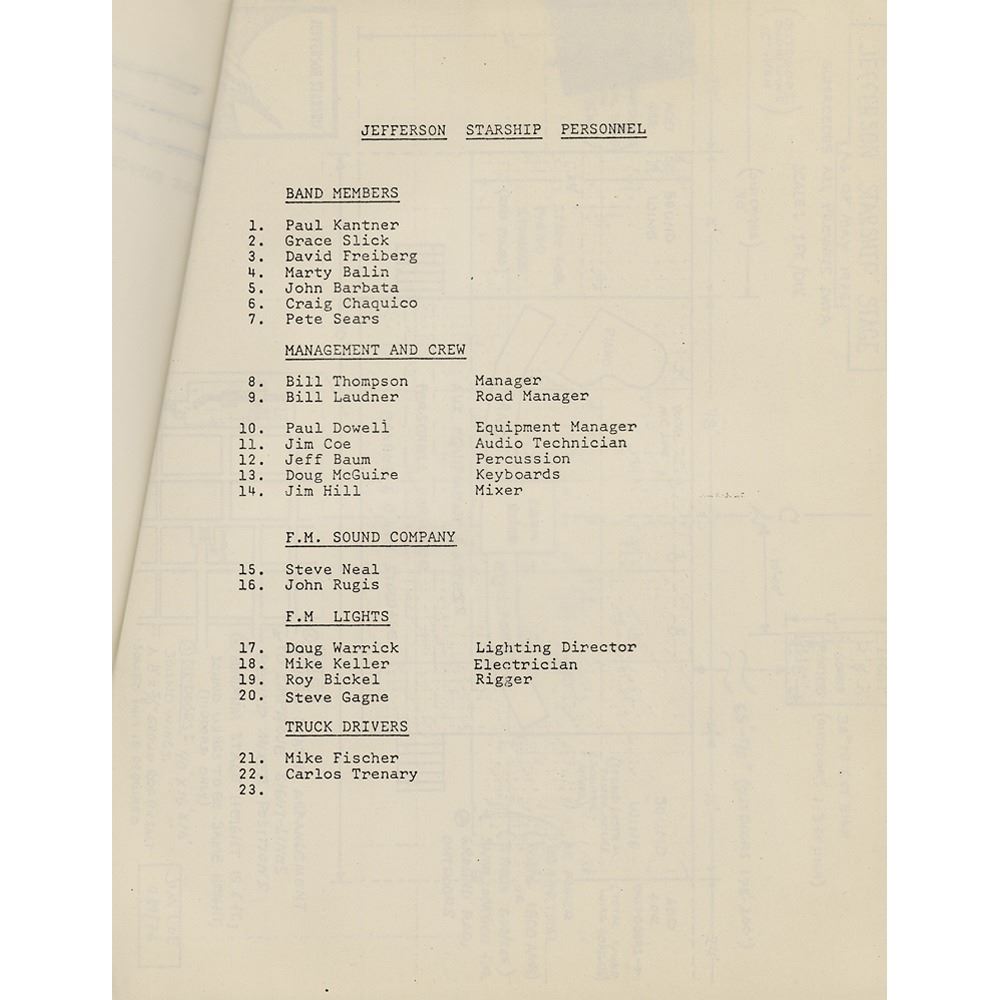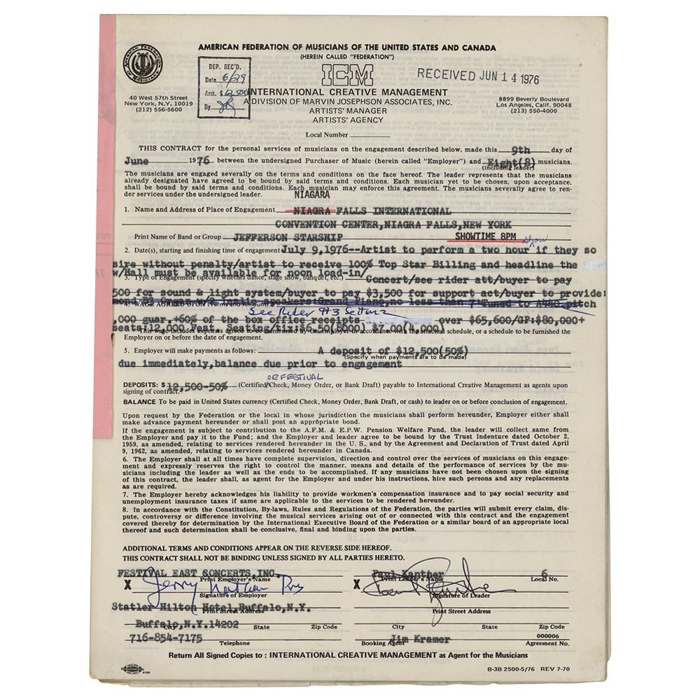 DS, one page, 8.5 x 11, June 9, 1976. An International Creative Management contract between Paul Kantner and Festival East Concerts, Inc., with the former confirming that Jefferson Starship will perform at the Niagara Falls International Convention Center on July 9, 1976. Signed at the conclusion in black ballpoint by Kantner. Receipts related to a "50% talent deposit" are stapled to the front, and an additional 21-page rider packet, which relates to business and technical production requirements, a full Jefferson Starship personnel page, and various layouts of the stage, is stapled to the back. In fine condition.
