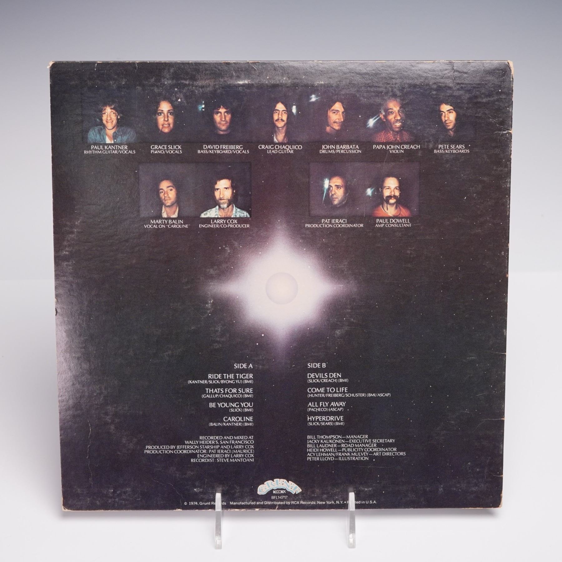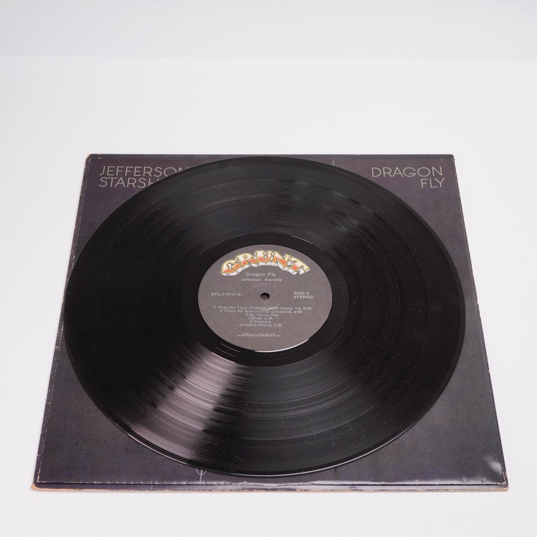 This listing is for a 12-inch vinyl record titled "Dragon Fly" by Jefferson Starship, released in 1974 under Grunt Records and distributed by RCA Records. The record bears the catalog number BFL1-0717, which is also etched into the runout groove, confirming its original U.S. pressing. The album represents a significant phase in the band's transition from Jefferson Airplane to Jefferson Starship, featuring prominent contributions from Paul Kantner, Grace Slick, and Marty Balin, along with David Freiberg, Craig Chaquico, John Barbata, Pete Sears, and Papa John Creach. The genre spans jazz, rock, funk/soul, and pop, incorporating styles such as alternative rock, blues rock, and rock & roll. The tracklist includes "Ride the Tiger," "That's for Sure," "Be Young You," and "Caroline" on Side A, with "Devil's Den," "Come to Life," "All Fly Away," and "Hyperdrive" on Side B. The record was produced and mixed at Wally Heider Studios in San Francisco, with engineering by Larry Cox and production coordination by Pat Ieraci. The cover features futuristic artwork by illustrator Peter Lloyd, and the back includes individual photographs of the band members and production team. This record is housed in its original printed sleeve and cover, retaining the full design and credits as issued.