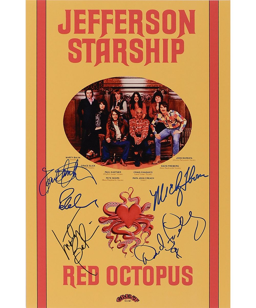 Color satin-finish 12 x 18 photo of the cover of their Red Octopus album, signed in blue and black felt tip by Paul Kantner, Marty Balin, Mickey Thomas, Pete Sears, and David Freiberg. In very fine condition.