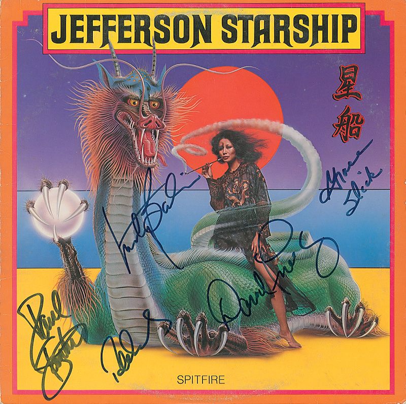 Spitfire album signed on the front cover in blue felt tip by Grace Slick, Marty Balin, Paul Kantner, Pete Sears, and David Freiberg. Scattered light cover wear and edge creases, otherwise fine condition. The record is included.