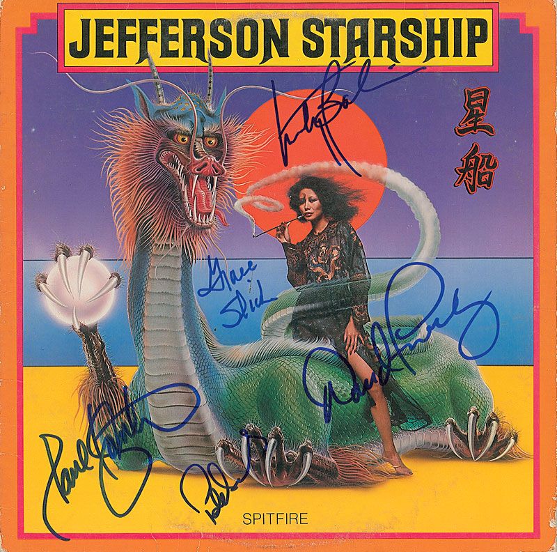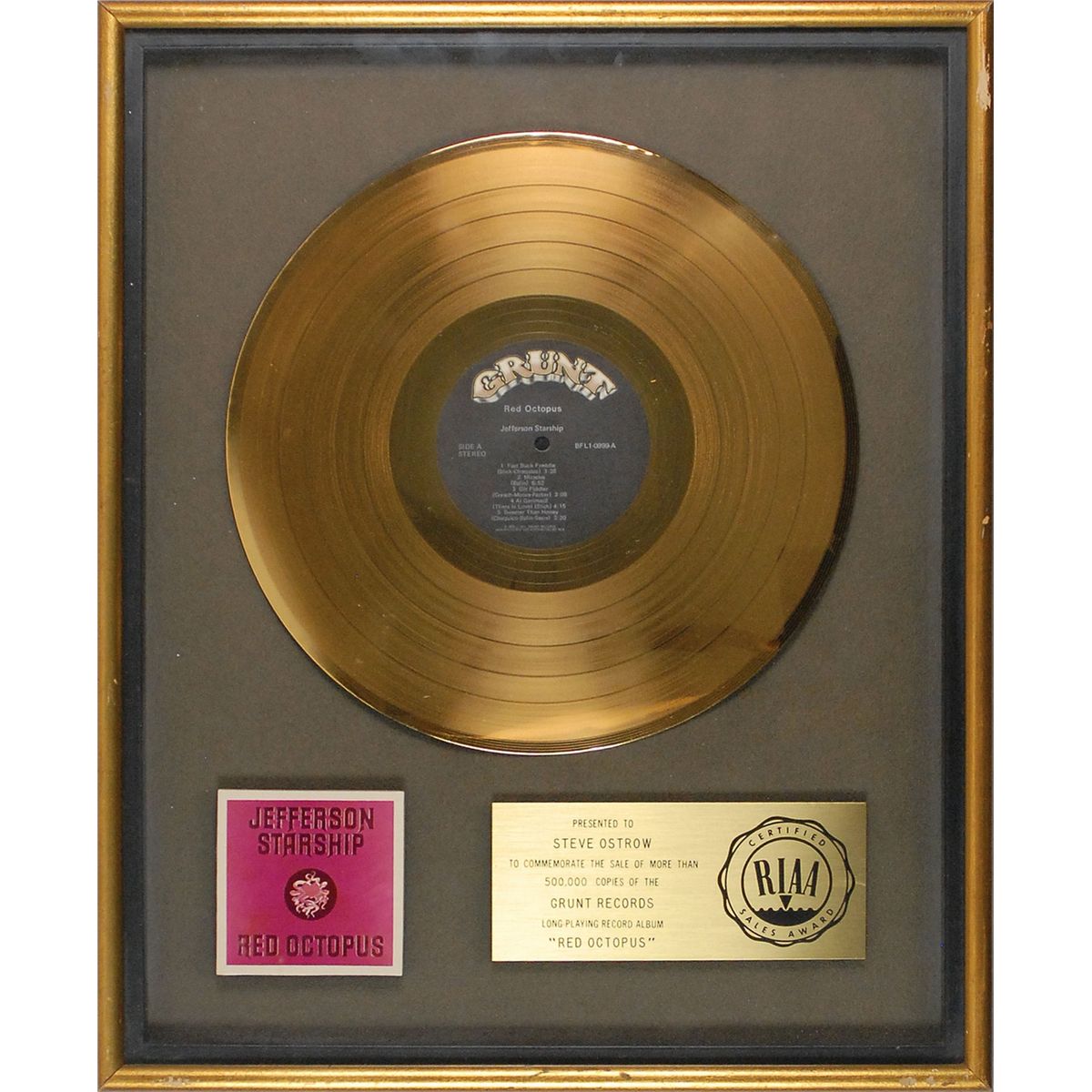 Two items: Spitfire album signed on the front cover in blue felt tip by Grace Slick, Paul Kantner, Marty Balin, David Freiberg, and Pete Sears; and an official floater-style RIAA gold record sales award presented to “Steve Ostrow to commemorate the sale of more than 500,000 copies of the Grunt Records long-playing record album ‘Red Octopus.’” Disc is framed with its plate and a color reproduction of the album cover to an overall size of 17 x 21. Award retains its original backing with a toned area where the New York Frame & Picture Co. label would have been affixed.