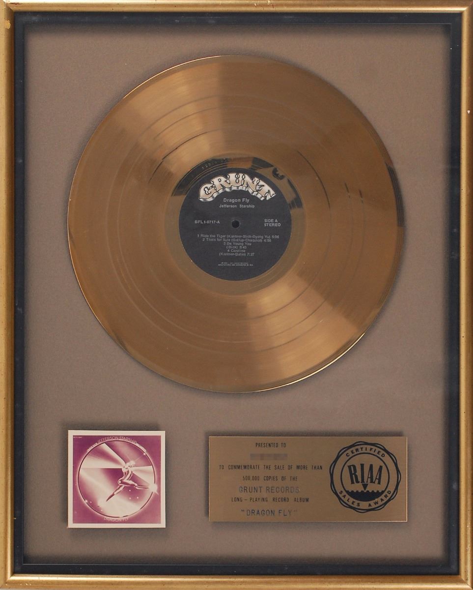 Official floater-style RIAA gold sales award presented “to commemorate the sale of more than 500,000 copies of the Grunt Records long-playing record album ‘Dragon Fly.’” Framed with its disc, plate, and a small image of the album cover to an overall size of 16.75 x 20.75. Award retains its original backing with a partially removed Creative Glassics label. In fine condition, with trivial surface rubbing to frame.