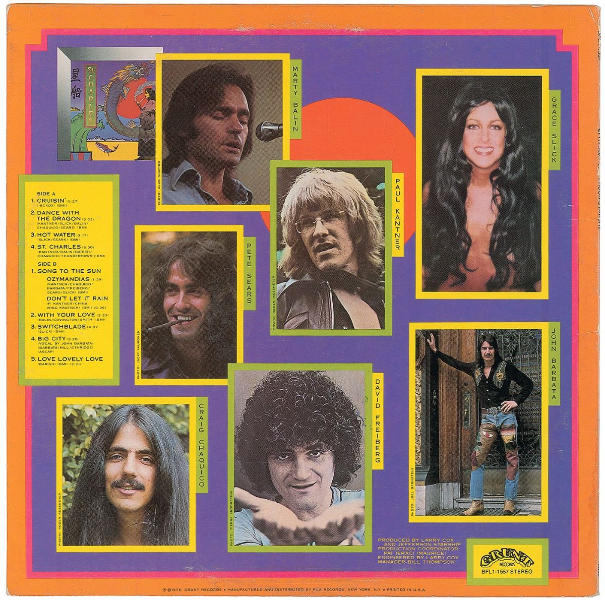 Spitfire album signed on the front cover in black felt tip by Paul Kantner, and in blue felt tip by Marty Balin, David Freiberg, Pete Sears, and Grace Slick, who adds “Pat Love.” In fine condition. The record is not included.
