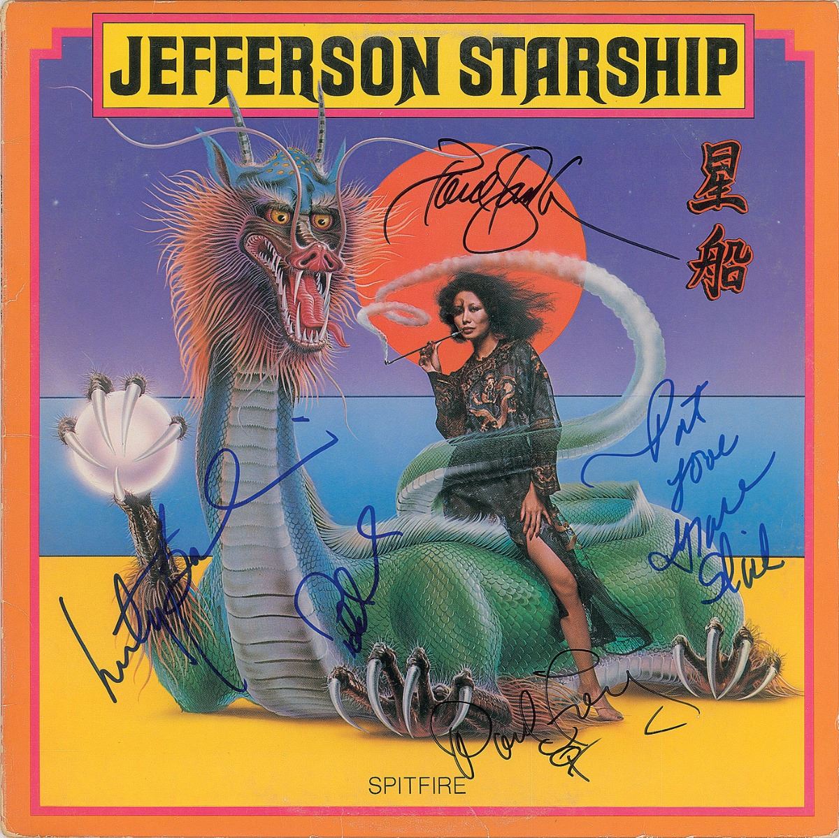 Spitfire album signed in blue and black felt tip by Grace Slick (ins), Paul Kantner, Marty Balin, David Freiberg, and Pete Sears. In fine condition. The record is not included.