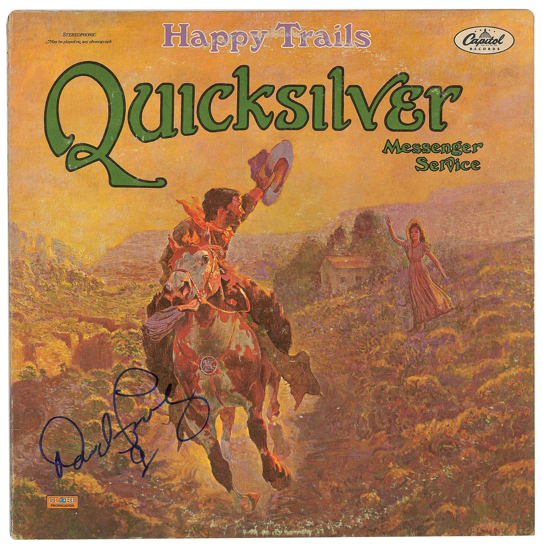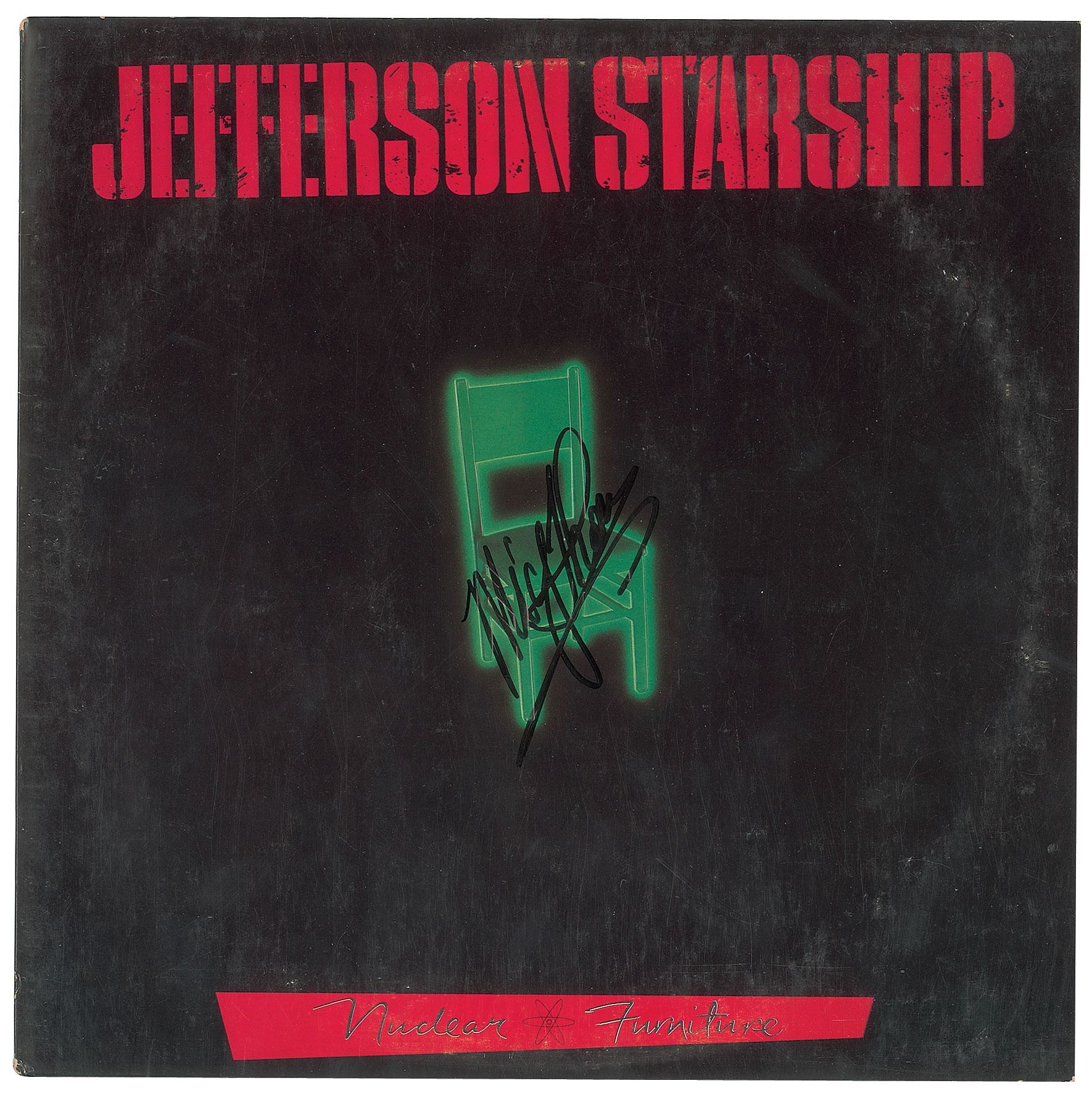 Five albums signed on the front cover by one or more members of Jefferson Starship, including: America's Choice by Hot Tuna, signed in blue felt tip by Jorma Kaukonen and Jack Casady; Dragon Fly by Jefferson Starship, signed in blue felt tip by Paul Kantner; Nuclear Furniture by Jefferson Starship, signed in black felt tip by Mickey Thomas; Happy Trails by Quicksilver Messenger Service, signed in blue felt tip by David Freiberg; and Balin by Marty Balin, who signs in blue felt tip. In overall very good to fine condition, with some light scuffing and edge wear. All the records are included. Consignor notes that all of the signatures were obtained in person.