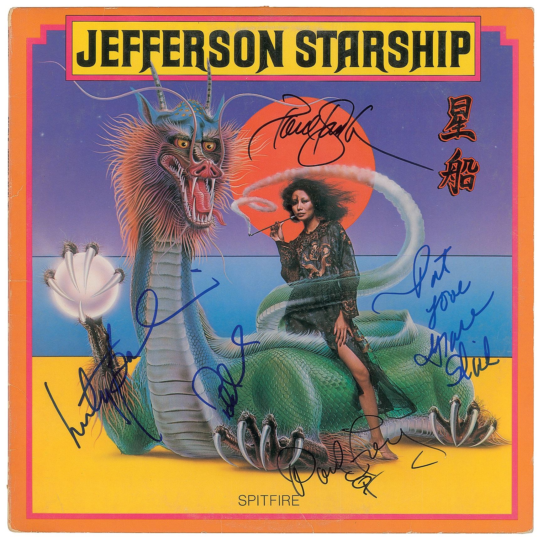 Spitfire album by Jefferson Starship, signed in blue and black felt tip by Paul Kantner, Marty Balin, David Freiberg, Pete Sears, and Grace Slick, who adds the inscription, "Pat, love." In fine condition. The record is not included.