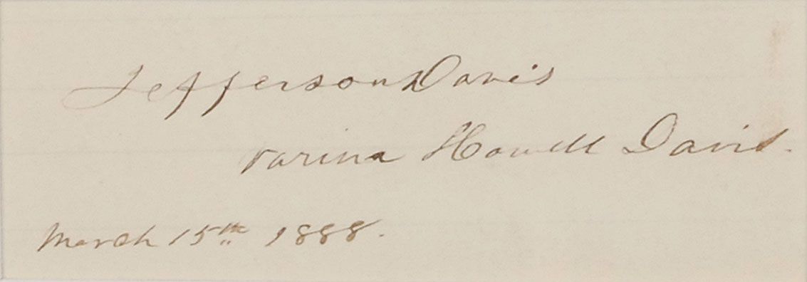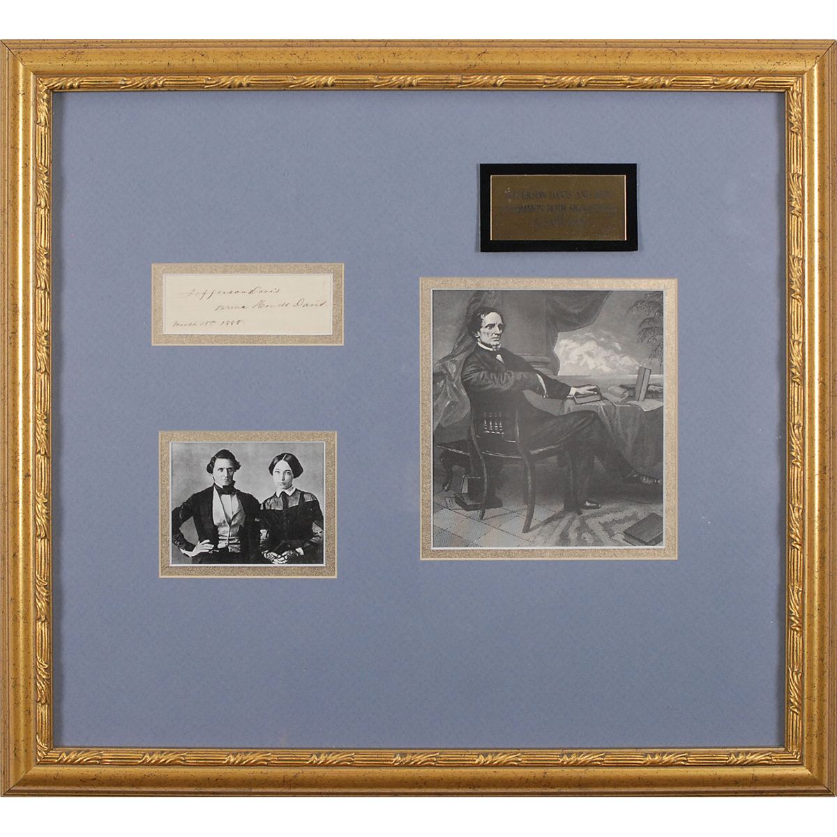 Ink signatures, “Jefferson Davis” and “Varina Howell Davis,” on an off-white 3.75 x 1.25 lightly-lined slip bearing a date notation of March 15, 1888. Double-matted and framed with two images and a descriptive plaque to an overall size of 19 x 17.5. In fine condition. An uncommon pair of signatures to find in combination on a single item.