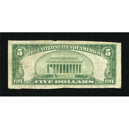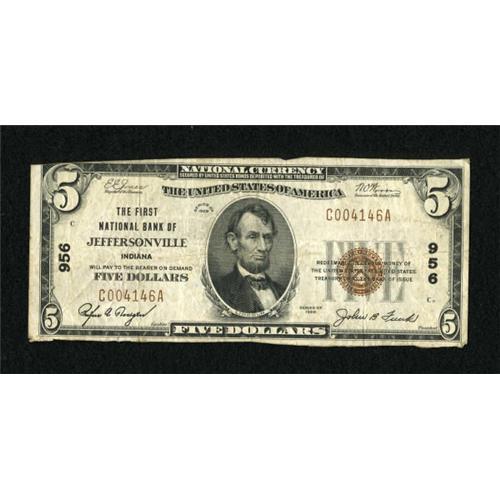 <B>Jeffersonville, IN</B></I> - $5 1929 Ty. 1 <B>The First NB</B></I> Ch. # 956<BR> This piece is cut a little sloppily, but is original and problem free. <B>Fine.</B></I><BR><BR><b>Shipping:</b> Coins & Currency (<a target="_blank" href="http://www.heritageauctions.com/common/shipping.php">view shipping information</a>)