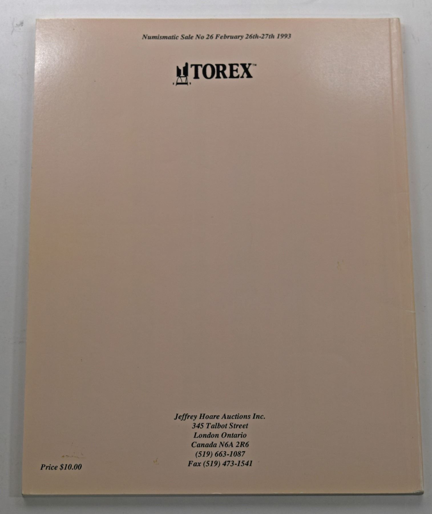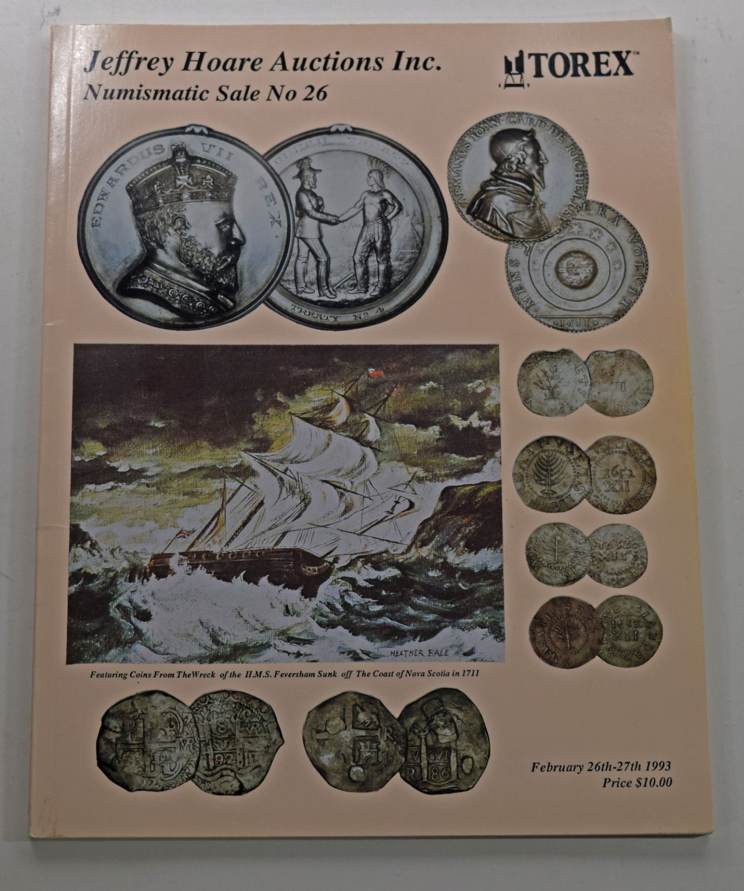 Jeffrey Hoare Auctions, Inc. NUMISMATIC SALE NO. 26 FEATURING COINS FROM THE WRECK OF THE H.M.S. FEVERSHAM SUNK OFF THE COAST OF NOVA SCOTIA IN 1711. February 26-27, 1993. 4to, 58 pages; Softcover; This catalog includes 96 lots of silver cobs from the H.M.S. Feversham (including a historical perspective of this 1711 wreck), 4 lots silver cobs from the "Johanna" wreck (1611), 11 lots of silver riders and daalers from the "De Liefde" wreck (1711), and 5 lots of silver cobs from the "Atocha" (1622). Subject: History - Sunken Treasure
