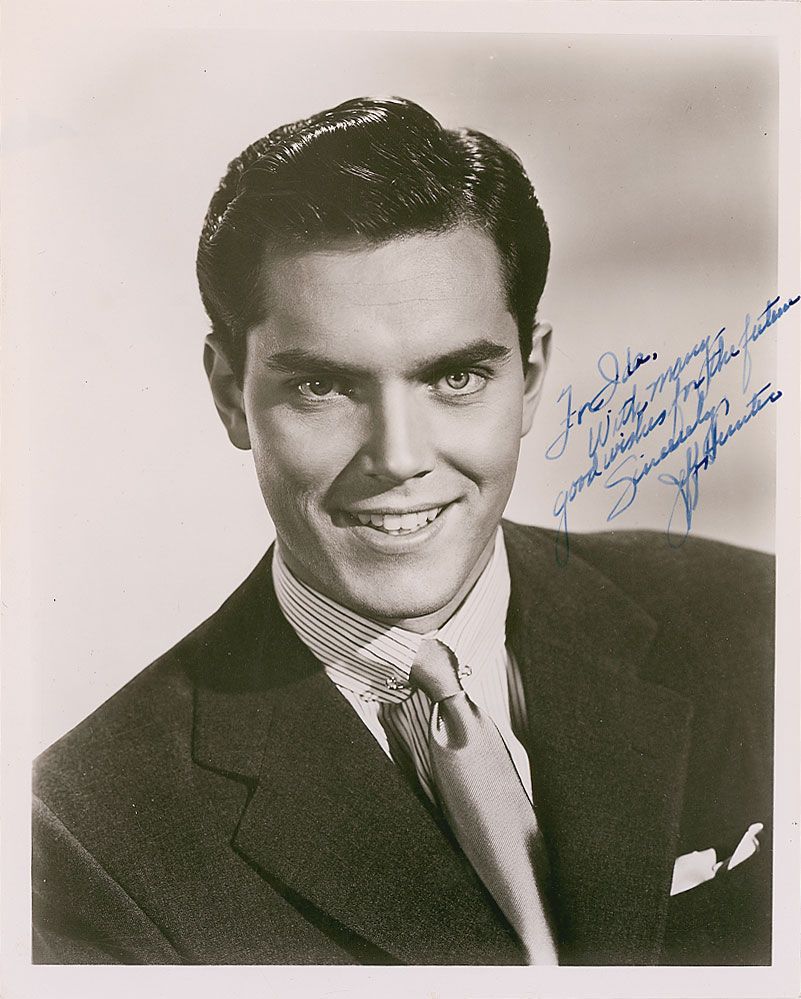 Leading man known for playing Jesus Christ in King of Kings. Also played Captain Christopher Robin Pike on Star Trek. Died after brain surgery, following an accidental fall. Handsome vintage glossy 8 x 10 photo, signed and inscribed in blue ink “For Ida, With many good wishes for the future. Sincerely, Jeff Hunter.” In fine condition, with some light edge curling.