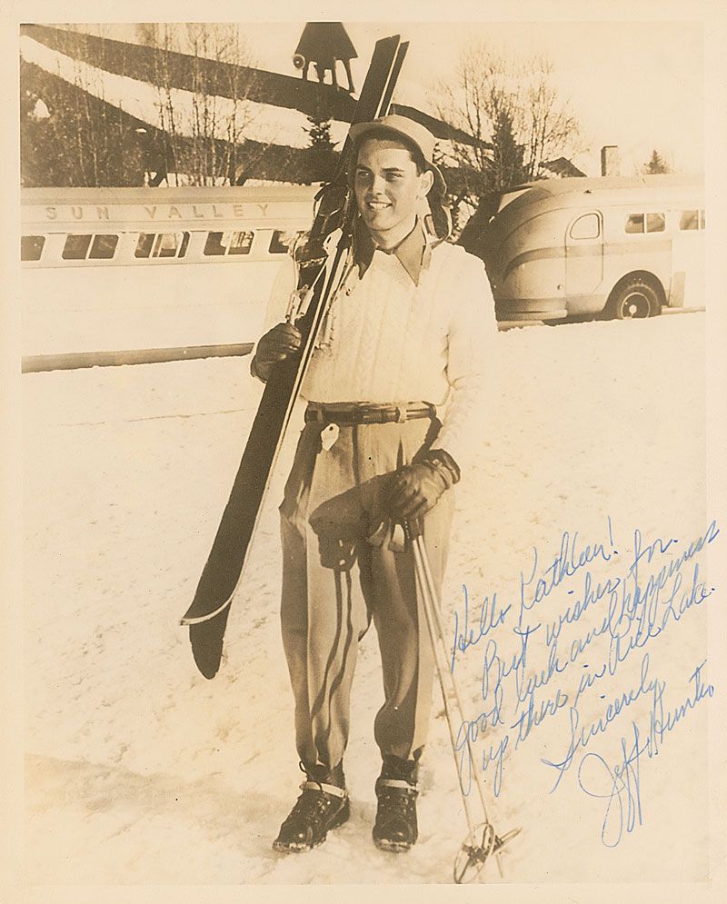 Actor (1926–1969) best known for playing Jesus Christ in King of Kings, and Captain Christopher Robin Pike on Star Trek. He died after brain surgery following an accidental fall. Vintage matte-finish 8 x 10 photo of Hunter walking through the snow with skis over his shoulder, signed and inscribed in blue ink, “Hello Kathleen! Best wishes for good luck and happiness up there in Rice Lake. Sincerely, Jeff Hunter.” In fine condition.