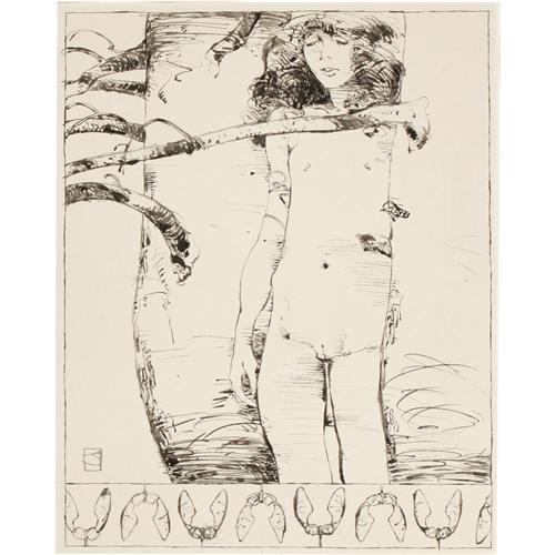 <B>Jeffrey Jones - "World Without End" Illustration Original Art (SQ Productions, 1980).</B></I> An effortless, flowing line is the trademark of this romantic figure study by Jeffrey Jones. Rendered in a sensitive ink line, this evocative illustration has an image area that measures 10.5" x 13", and the art is in Excellent condition. Signed with Jones’ monograph at the bottom left.<BR><BR><b>Shipping:</b> Flat Material, Large (<a target="_blank" href="http://www.heritageauctions.com/common/shipping.php">view shipping information</a>)