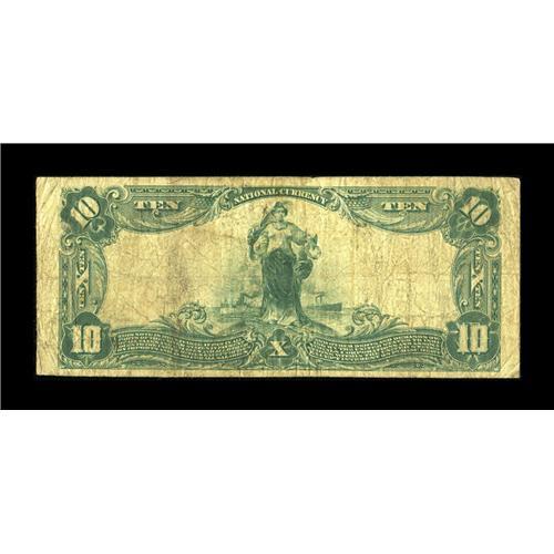 <B>Jellico, TN</B></I> - $10 1902 Plain Back Fr. 624 <B>The First NB</B></I> Ch. # (S)7665<BR>This addition to the census makes a total of five large notes now traced from this very elusive issuer. Tonight's <B>Very Good</B></I> offering is the first $10 Plain Back to emerge from the shadows and will likely cause quite a stir amongst Tennessee specialists. In fact, although two banks issued from here, this and the National Bank of Jellico, only six notes total are now documented for the entire community, with this being the only $10 Plain Back from either bank. Based on its scarcity, both as a community, bank, as well as denomination and type within a bank, we submit that our estimate may prove conservative given the current state of demand for rare Nationals.<BR><BR><b>Shipping:</b> Coin/Currency (<a target="_blank" href="http://www.heritageauctions.com/common/shipping.php">view shipping information</a>)