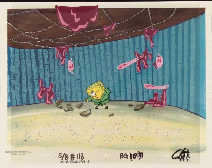 This animation cel and reproduction background are from the Nickelodeon TV show SpongeBob Squarepants. The story takes place under the deep blue sea in Bikini Bottom, where SpongeBob resides. SpongeBob, who is a yellow, porous sponge, is your typical happy-go-lucky character, as he is always cheerful and enjoys making people laugh. Patrick Star, SpongeBob's neighbor who is a starfish, is your average children's show idiot, as he boasts knowing nothing and is often getting himself into ridiculous situations. Between the homes of these two lies the home of the miserable Squidward, a squid, who is known for being grouchy and playing tricks on SpongeBob and Patrick. Both SpongeBob and Squidward work at the Krusty Krab, a fast food business run by the greedy money-loving Mr. Krabs, a crab, the arch rival of the evil, possibly misunderstood, Plankton. Another neighbor, Sandy Cheeks, an athletic squirrel who normally wears an astronaut's space suit, was introduced in "Tea at the Treedome." She spends most of her time inventing and experimenting. There is jelly on the walls.Original Printed Background and Animated Cel Overall Size of Background: 11" x 17" Overall Size of the Cel: 10 1/2" x 12 1/2" Very good condition This is an original hand-painted cel set-up used in the production of an episode of "SpongeBob SquarePants." Each one-of-a-kind set-up represents a slight change in position of the characters. When individually photographed and projected in rapid succession, the images appear to move.