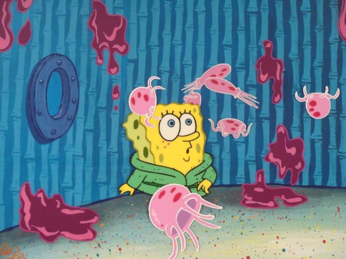 To create production cels, the original animator's drawing is transferred onto an acetate cel (by hand-inking and/or photo copying). The cel is then hand-painted on the reverse side. The background accompanying this set-up is a hand-painted original production background. The background is ready to be matted and framed. It is a colored background with a cel and has the animator's notations at the bottom of both. The cel has multi-layers; first the three separate floating jellyfish, next is Spongebob, and then four grouped together jellyfish.