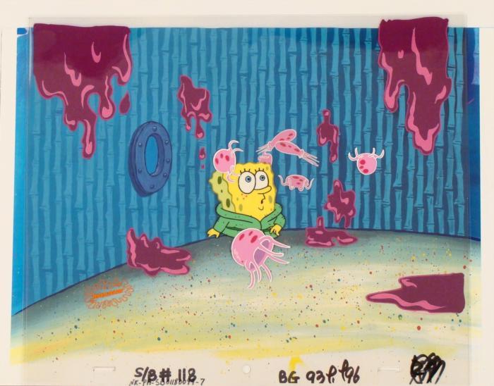 To create production cels, the original animator's drawing is transferred onto an acetate cel (by hand-inking and/or photo copying). The cel is then hand-painted on the reverse side. The background accompanying this set-up is a hand-painted original production background. The background is ready to be matted and framed. It is a colored background with a cel and has the animator's notations at the bottom of both. The cel has multi-layers; first the three separate floating jellyfish, next is Spongebob, and then four grouped together jellyfish.